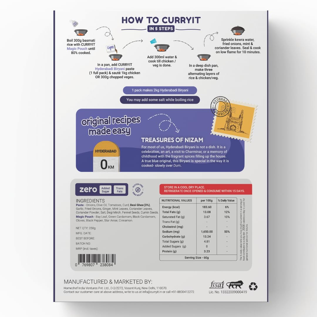 Curryit Instant Hyderabadi Biryani Curry Paste | Just Add Rice & Chicken, Mutton, Paneer | Ready In 30 Mins | Serves 4-6 | Made With Ghee | No Preservatives | Ready To Cook Indian Masala Gravy | 250G