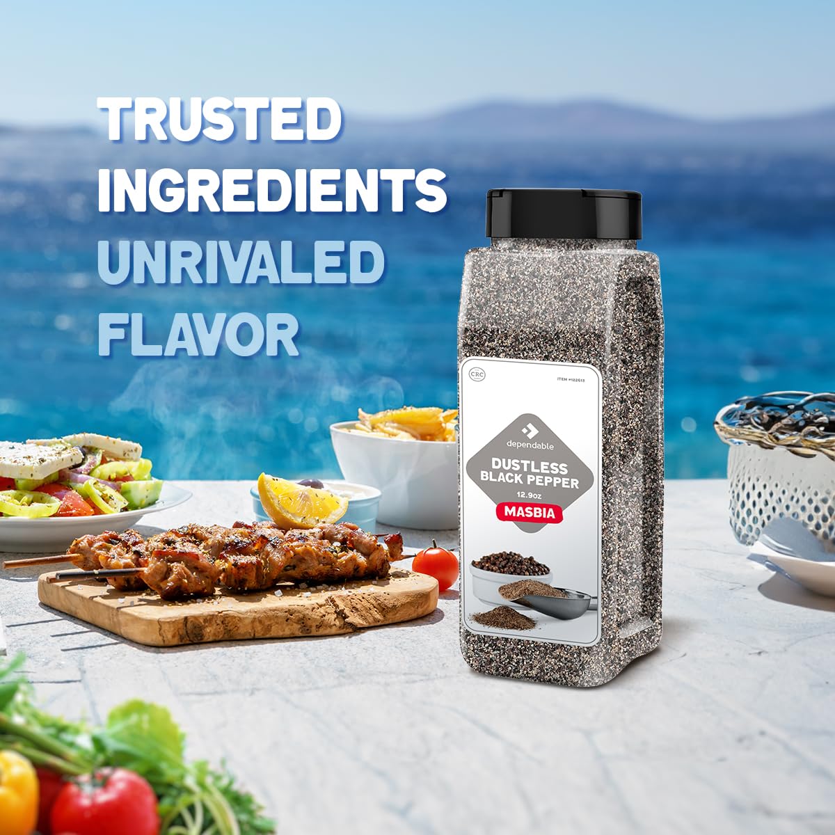 Dependable Foods Dustless Black Pepper is crafted from 100% natural and non-GMO black pepper. The refined grind offers a unique dustless experience, allowing you to focus on the flavor of your culinary creations. Packaged in a convenient 12.9 oz. bulk jar, this pepper provides ample supply for your cooking needs, making it a practical addition to any kitchen. The formulation is salt-free and allergen-free, ensuring pure taste without additives. Additionally, it is Kosher certified, reflecting Dependable Foods commitment to quality and authenticity.