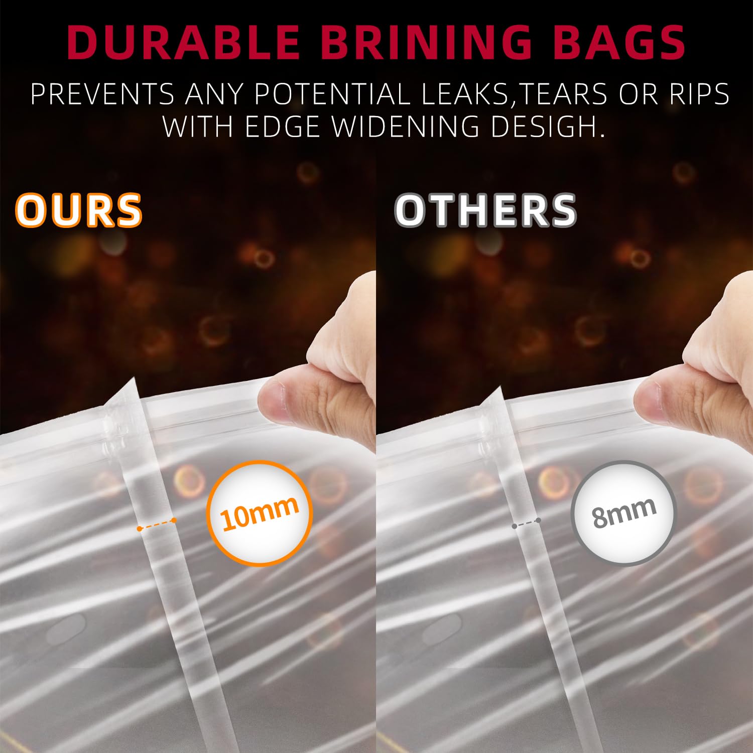 Q: Is this brining bag safe for food storage?A: Yes, our brining bags are made from food-grade standard materials, specifically an extra-thick 125-micron plastic, which is safe for storing food and reduces the risk of tearing.