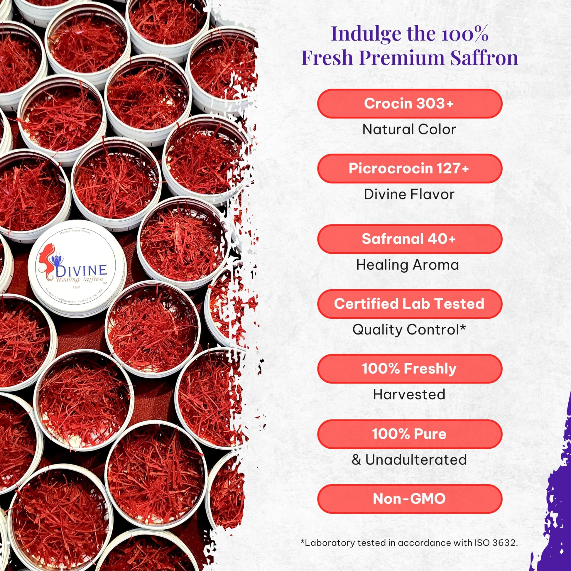 - Q: What certifications does Divine Saffron have? A: Divine Saffron is certified according to ISO 3632 standards, ensuring it meets the highest quality criteria. The saffron's crocin, picrocrocin, and safranal levels are tested to confirm its premium quality.