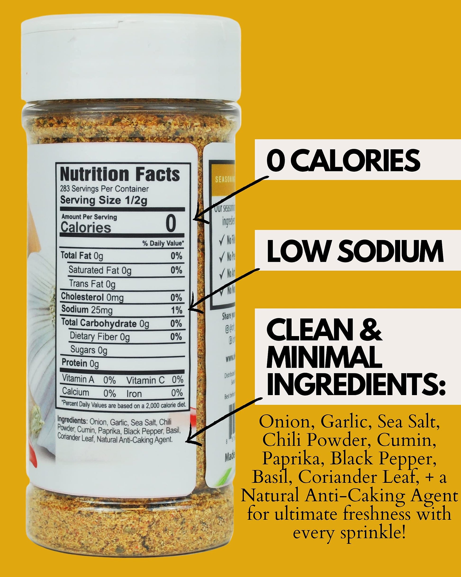 Q: What are the main ingredients in Everything Seasoning by Oh My Spice?A: Everything Seasoning by Oh My Spice is made from a blend of fresh, natural herbs without any fillers. It is gluten-free, low sodium, and contains no calories, carbs, sugar, or preservatives.