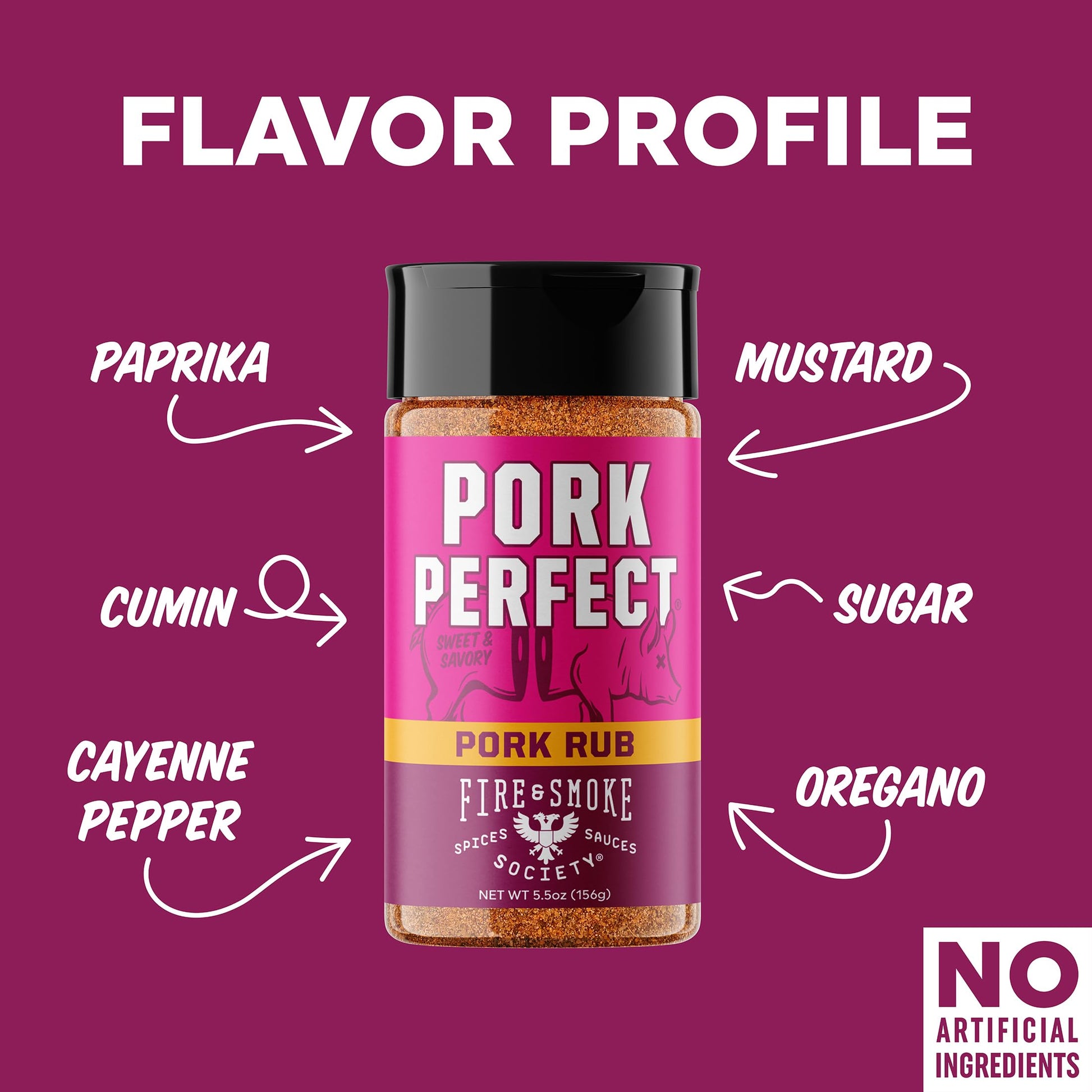 - Q: What are the main ingredients in the Pork Perfect Pork Rub? A: The main ingredients in the Fire & Smoke Society Pork Perfect Pork Rub include paprika, mustard, cayenne pepper, and salt, which together create a balanced and flavorful seasoning mix.