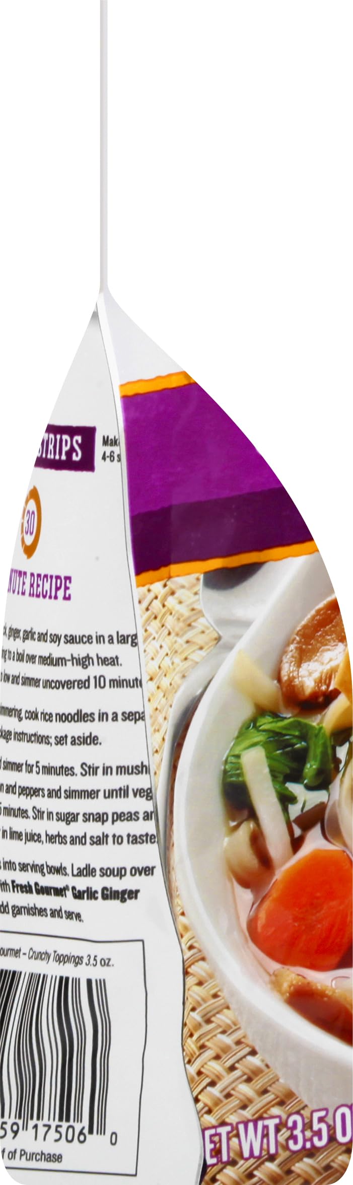 - Q: What are the main ingredients in Fresh Gourmet Wonton Strips? A: Fresh Gourmet Wonton Strips primarily contain wheat and are flavored with garlic and ginger. They are a crunchy topping suitable for various dishes.