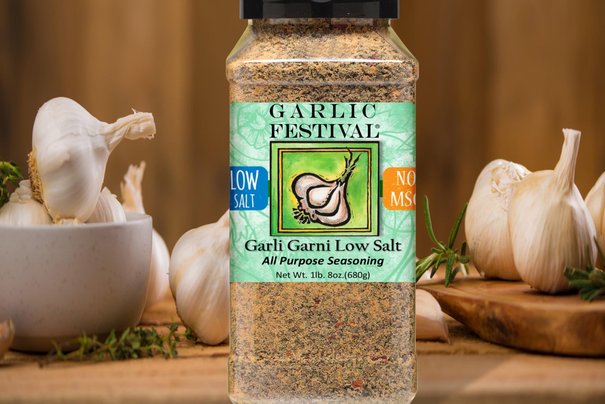 - Q: How much sodium is in the Garli Garni seasoning? A: Each 1/4 teaspoon serving of the Garli Garni seasoning contains only 27mg of sodium, which is significantly lower than traditional garlic seasonings, making it ideal for low-sodium diets.