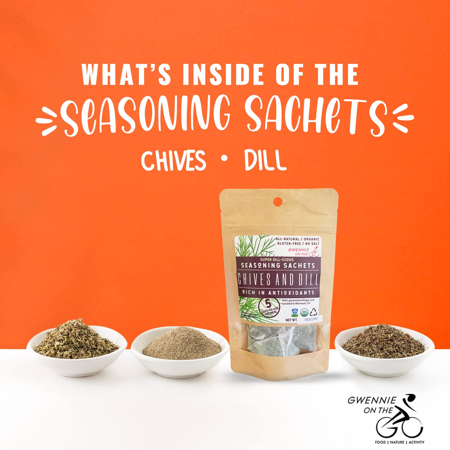 - Q: What are the main ingredients in Gwennie on the GO seasoning sachets? A: Gwennie on the GO seasoning sachets primarily contain organic chives and dill. These ingredients are designed to enhance the flavor of various dishes such as salads, seafood, and soups.