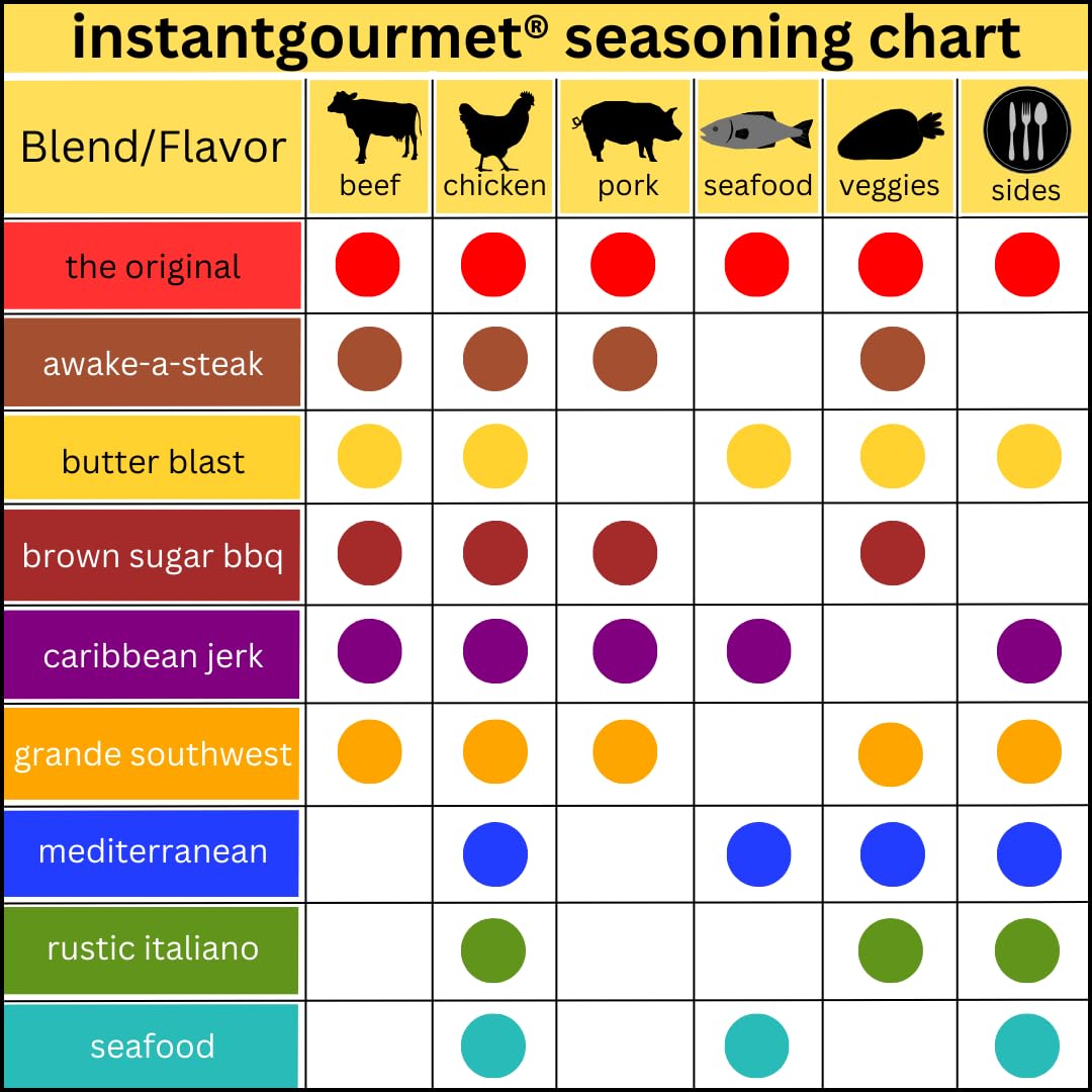 - Q: What makes Instant Gourmet Original Seasoning an all-purpose seasoning? A: Instant Gourmet Original Seasoning is designed to enhance the flavor of a wide variety of dishes, from meats and poultry to seafood and vegetables. Its unique blend of all-natural ingredients ensures that it complements any food, making it a versatile choice for everyday cooking.