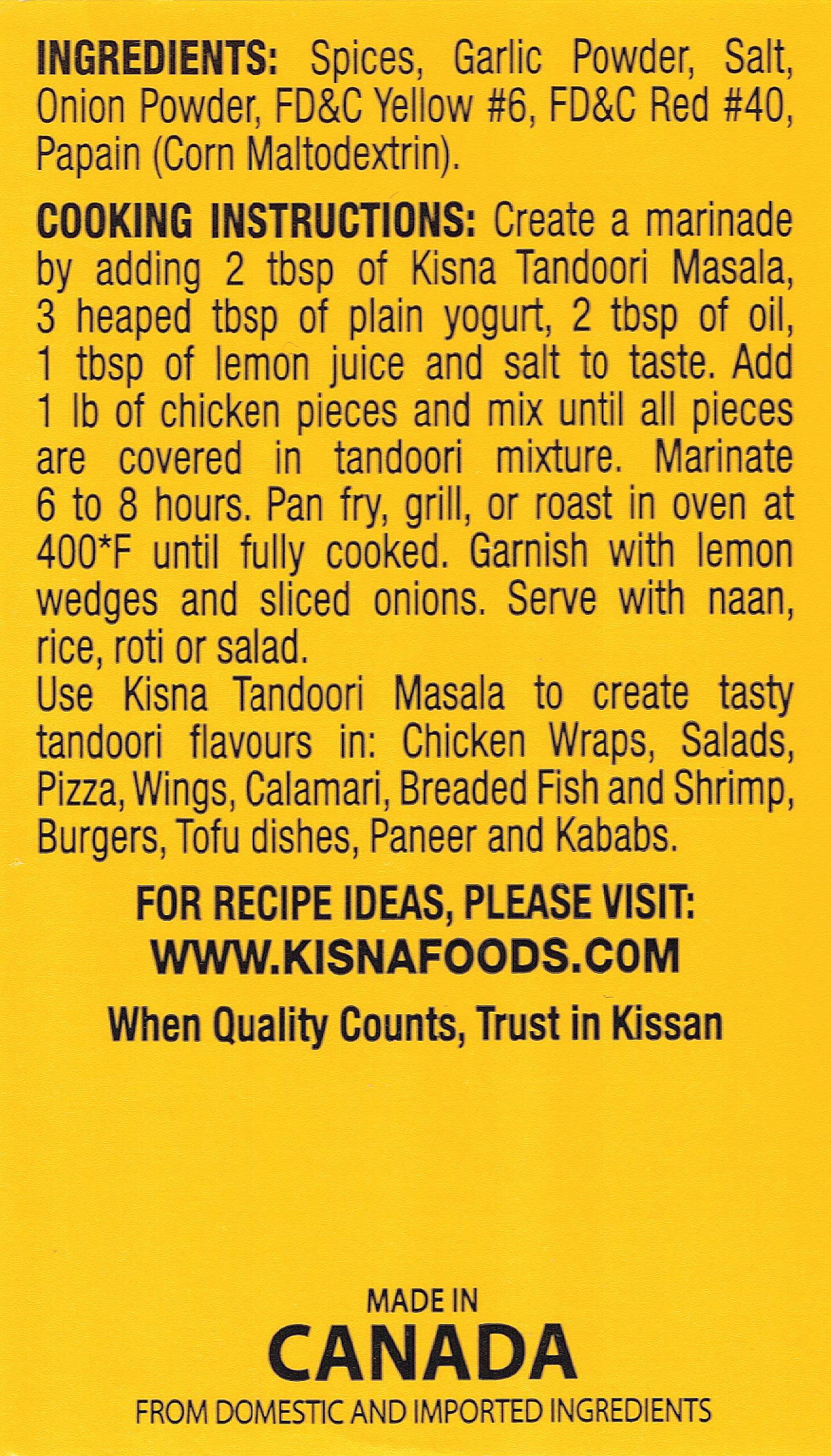This Excellent Product Is The Us Variation From Our First Product Launched Over 30 Years Ago, A Wonderful Blend Of Fine Quality Spices That Bring Authentic Aromatic Tandoori Flavours To Every Dish Made! Kisna Tandoori Masala Is Traditionally Used To Make Tandoori Chicken, But Also Can Be Used To Create Delicious Vegetarian And Seafood Dishes. Simply Create A Marinade With Kisna Tandoori Masala, And Coat Your Favourite Meat, Vegetable Or Seafood With It. Barbeque, Grill, Roast, Or Stir-Fry Your Ingredients To Create A Mouth-Watering, Authentic Tandoori Meal.