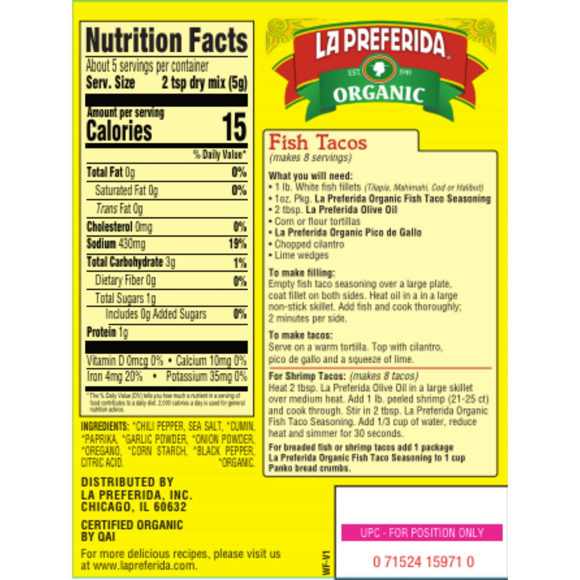 • Q: What ingredients are in La Preferida Organic Fish Taco Seasoning? A: La Preferida Organic Fish Taco Seasoning is made with a blend of natural ingredients, including chili pepper, sea salt, cumin, paprika, garlic powder, onion powder, oregano, and black pepper. It contains no MSG or artificial preservatives.