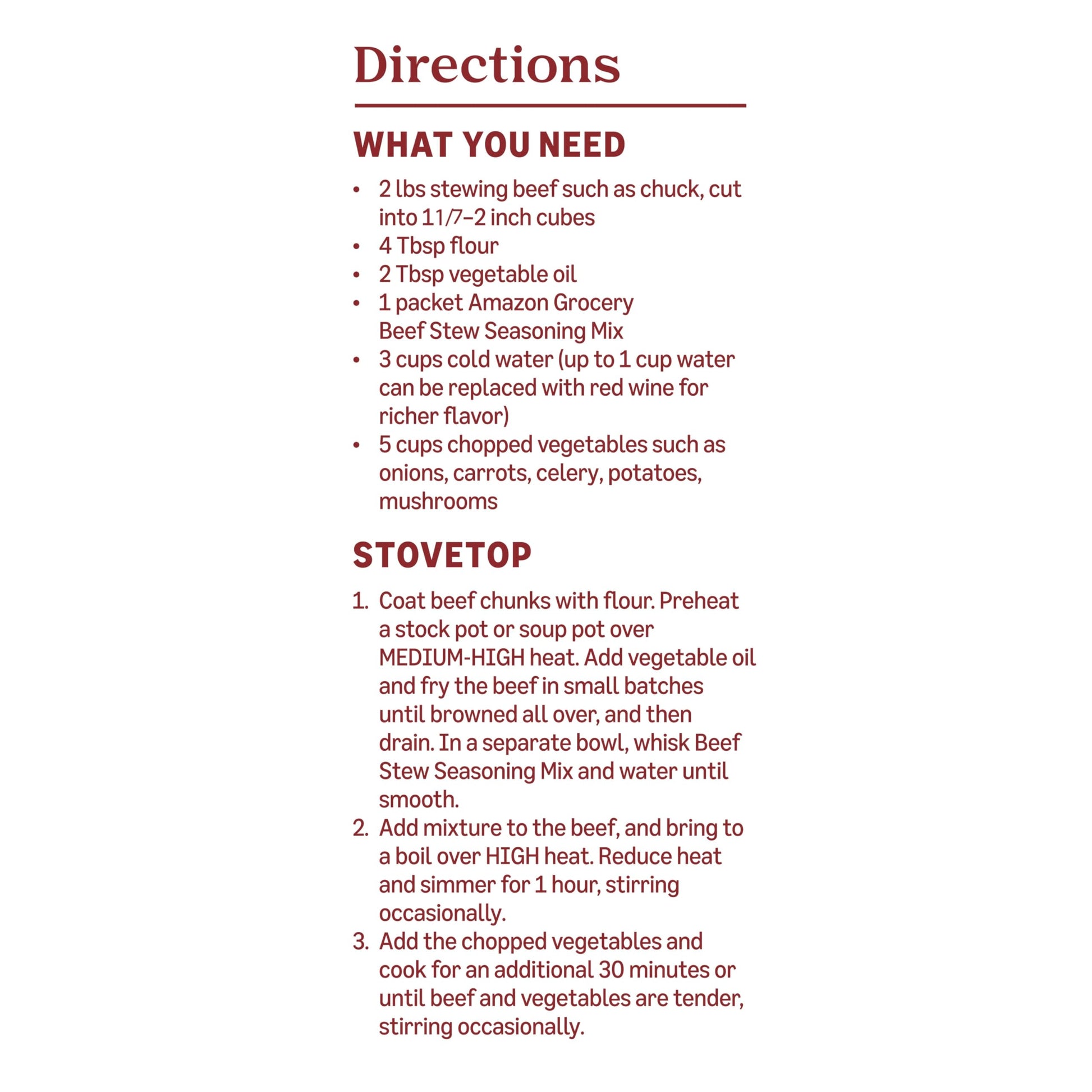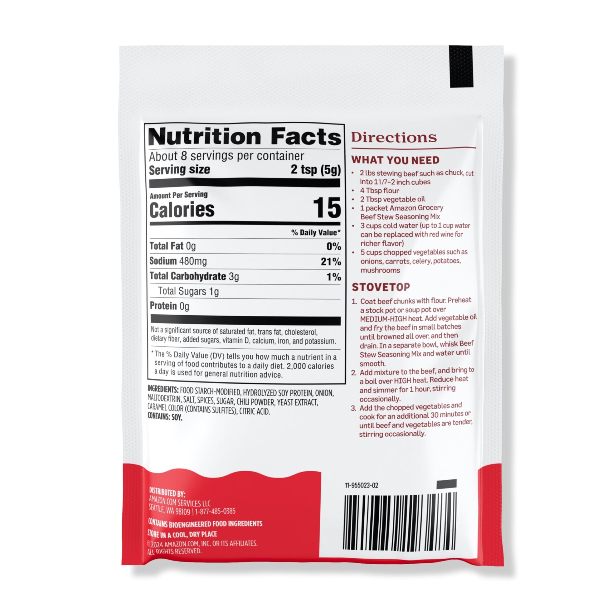 - Q: What is included in the Amazon Grocery Beef Stew Seasoning Mix package? A: The package includes twelve individual packets, each containing one and a half ounces of Beef Stew Seasoning Mix.