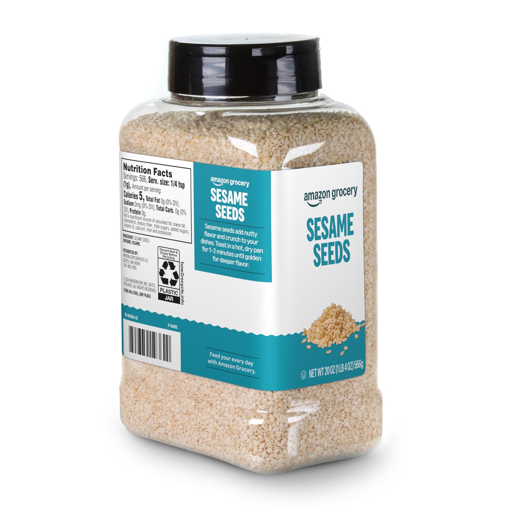 - Q: What size is the Amazon Grocery Sesame Seeds container? A: The Amazon Grocery Sesame Seeds are available in a twenty-ounce container.