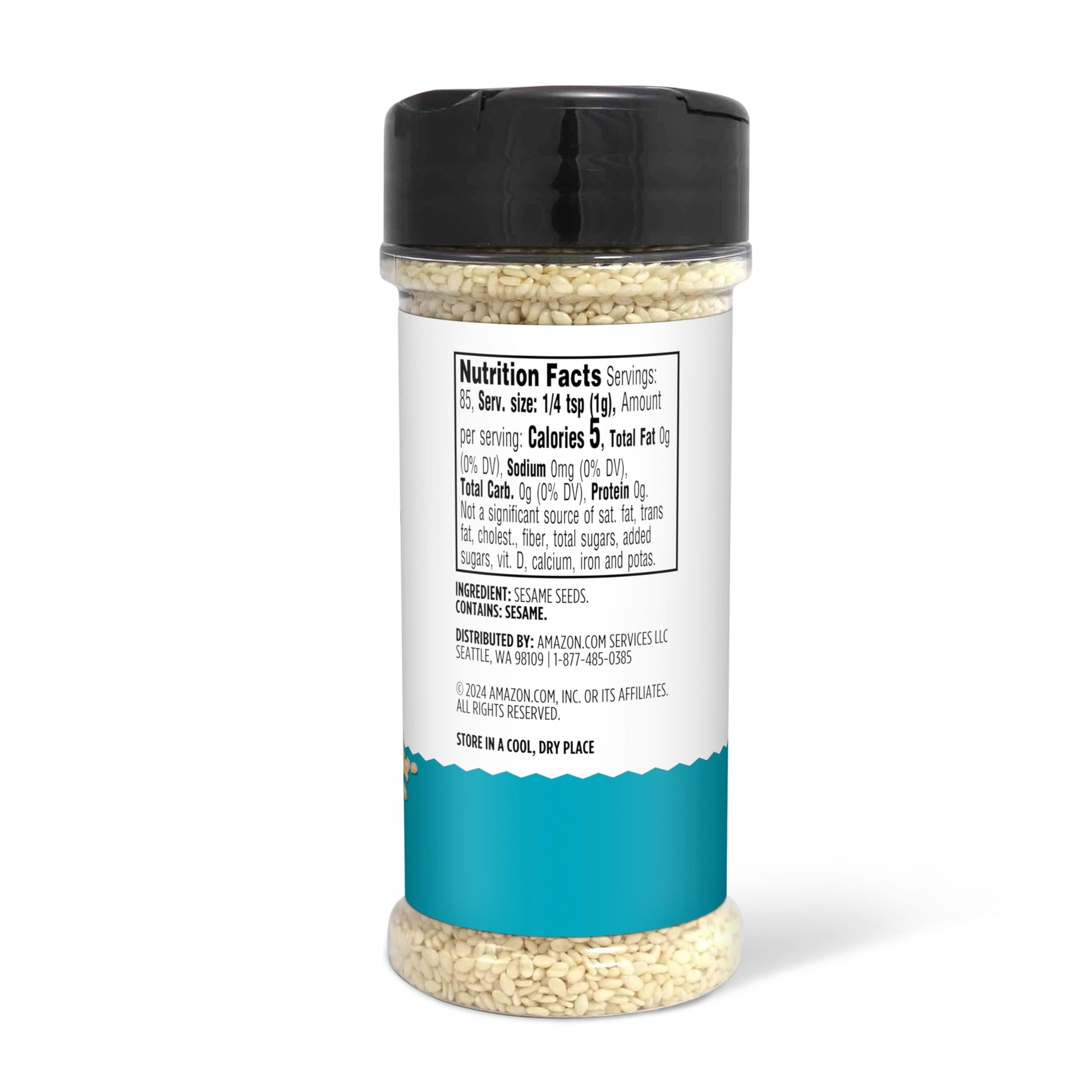 - Q: What is the size of the Amazon Grocery Sesame Seeds container? A: The Amazon Grocery Sesame Seeds come in a three-ounce container.