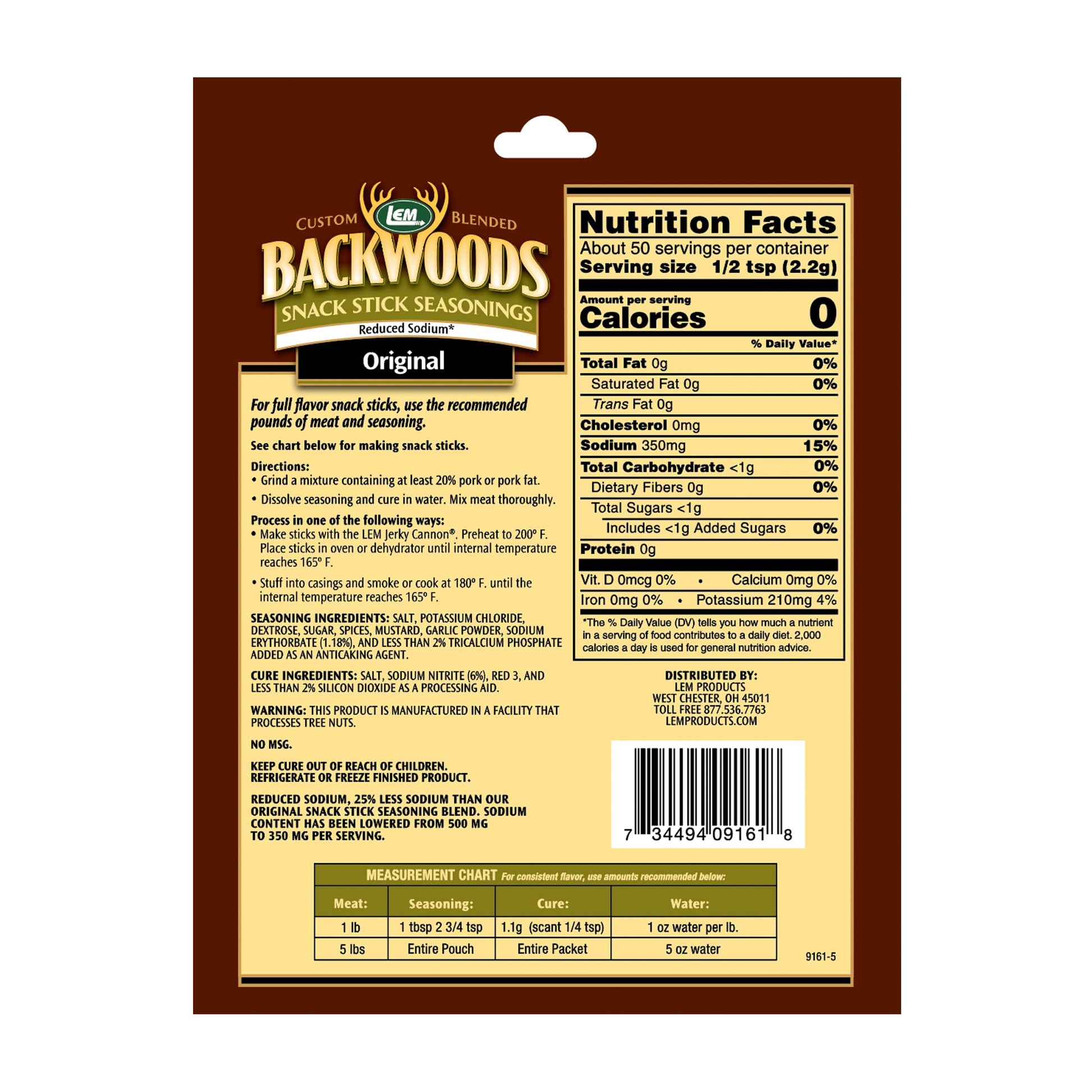 - Q: What is the sodium content of LEM Products Backwoods Reduced Sodium Original Snack Stick Seasoning? A: The LEM Products Backwoods Reduced Sodium Original Snack Stick Seasoning contains three hundred fifty milligrams of sodium per serving, which is twenty-five percent less than the original seasoning blend.