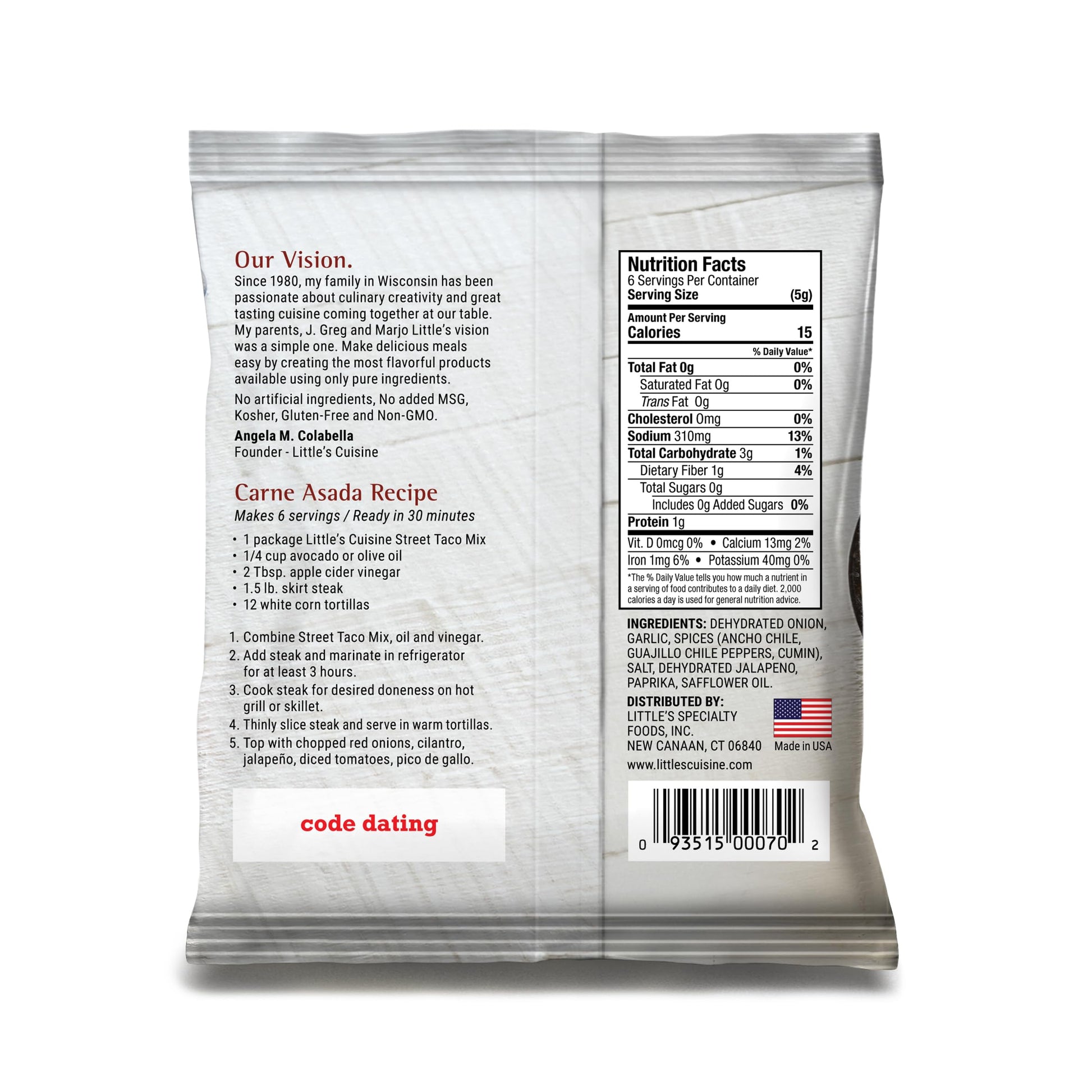 - Q: What are the main ingredients in Little's Cuisine Carne Asada Street Taco Seasoning Mix? A: Little's Cuisine Carne Asada Street Taco Seasoning Mix features a blend of high-quality spices that enhance the flavor of steak without any artificial additives or preservatives. It is free from MSG, sugar, gluten, and GMOs, making it a natural choice for those with dietary restrictions.
