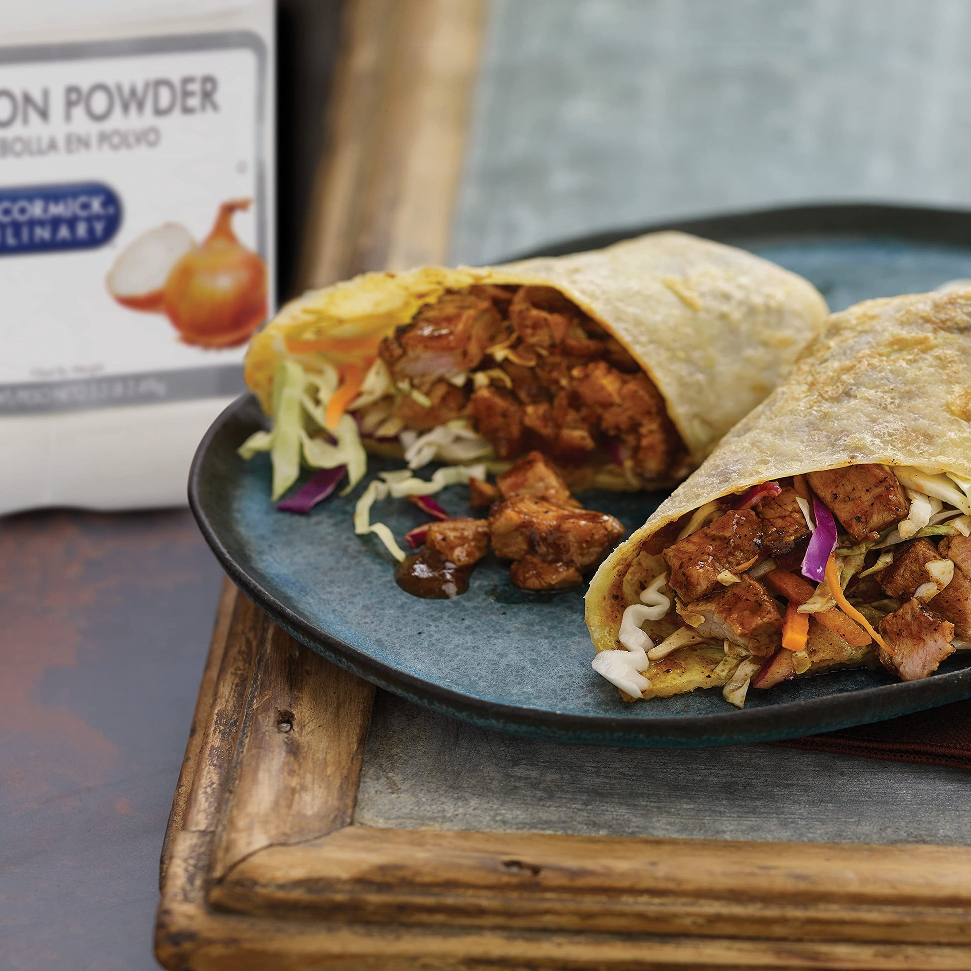 Add a kick to signature dishes at your pizzeria, bar or restaurant with McCormick Culinary Onion Powder. Ground onion powder is an effective and flavorful substitute for fresh onion, and you can buy it in 5.5-pound containers designed to enhance back-of-house efficiencies. Just one tablespoon replaces the intensity and flavor of a medium-sized onion. This ready-to-use offers a pungent, sweet flavor that is sure to add something special to your signature dishes. Compared to larger granules of onion, the fine, uniform texture of ground onion powder blends with other ingredients more evenly. Onion powder seasoning's powdery texture makes it well-suited for marinades, soups, sauces, ground meat, bread or your favorite vegetables. Finely ground onion powder from McCormick:- Saves preparation time. - Is kosher with no added MSG.- Disperses well in liquid. - Can replace fresh onion.- Has a shelf life of 720 days.- Lasts longer than fresh onion.Onion powder seasoning is a versatile ingredient. Consider that onion is a staple in many dishes worldwide, and Italian, Latin American, Middle Eastern and Asian cuisines frequently require those flavors. McCormick Onion Powder is ground and ready to go, saving you time and labor for high-output kitchens. A few shakes of the 5.5-pound container will season your food to taste. Granulated onion seasoning also has a powdery texture that allows it to dissolve into liquids quickly, making it perfect for use in chilis, stews and soups. Common dishes that use powdered onion include:- Smoky honey buffalo sauce.- Buffalo tomato sauce.- Spiced potato and tomato tacos.- Peppercorn dressing.- Crunchy jalapeno popper dip.McCormick Culinary Onion Powder comes in a 5.5-pound container with a sizeable opening so that you can use measuring spoons. Avoid using wet spoons and cups or exposing onion flakes to humidity, heat, direct sunlight and fluorescent light.