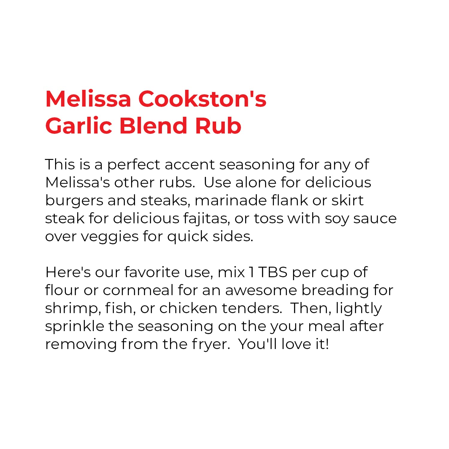 - Q: What makes Melissa Cookston's Garlic Blend BBQ Rub different from other BBQ rubs? A: Melissa Cookston's Garlic Blend BBQ Rub stands out due to its unique formulation created by a 7-time world barbecue champion. It combines finely powdered garlic with quality ingredients, ensuring a robust flavor without the hassle of chopping fresh garlic.