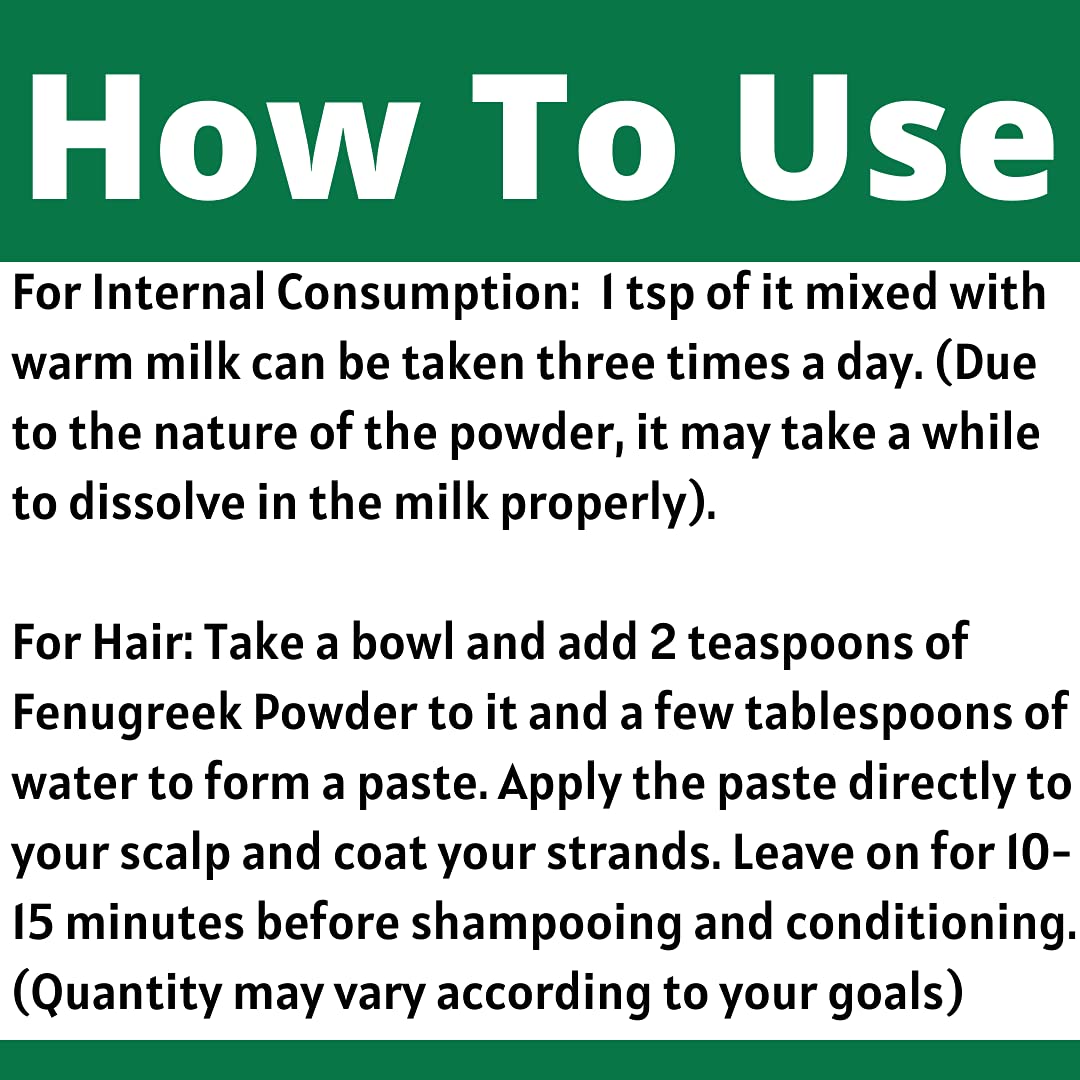 - Q: How do I consume Fenugreek Powder effectively? A: For internal consumption, mix 1 teaspoon of Fenugreek Powder with warm water or milk. It is recommended to take this mixture three times a day. Note that it may take some time for the powder to dissolve completely.