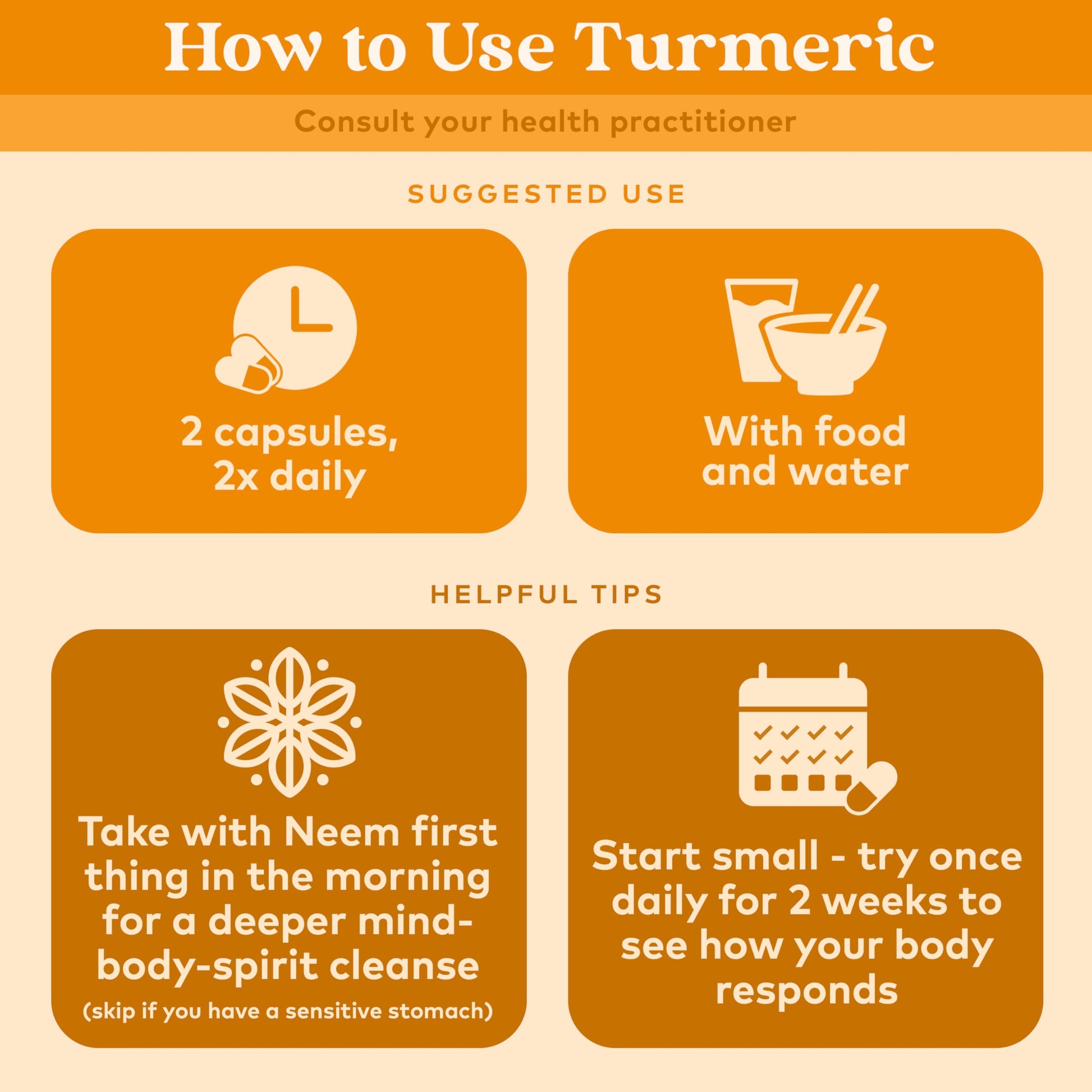 - Q: What is the recommended dosage for ORGANIC INDIA Turmeric Curcumin? A: The recommended dosage is two capsules per day, or as directed by a healthcare professional. It is best to take them with food to enhance absorption.