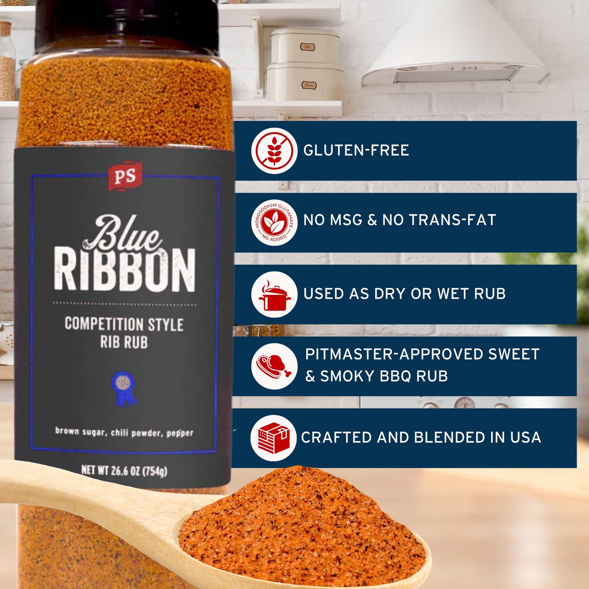 - Q: What is the size of the container for the Blue Ribbon Rib Rub? A: The Blue Ribbon Rib Rub comes in a twenty-six point six-ounce container, providing ample seasoning for multiple uses.