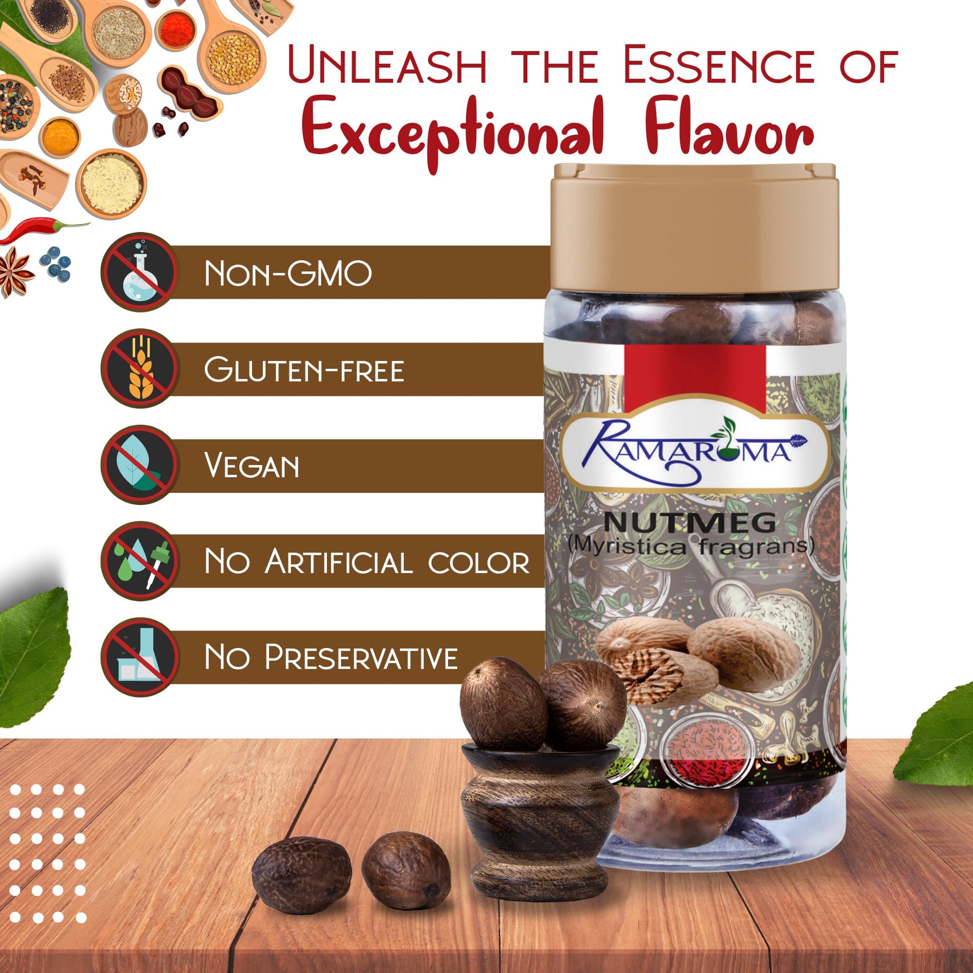 - Q: Is Ramaroma Nutmeg Whole organic and free from artificial additives? A: Yes, Ramaroma Nutmeg Whole is all-natural, vegan, gluten-friendly, and NON-GMO. It contains no artificial colors or preservatives, ensuring you get pure and unadulterated spice for your cooking needs.