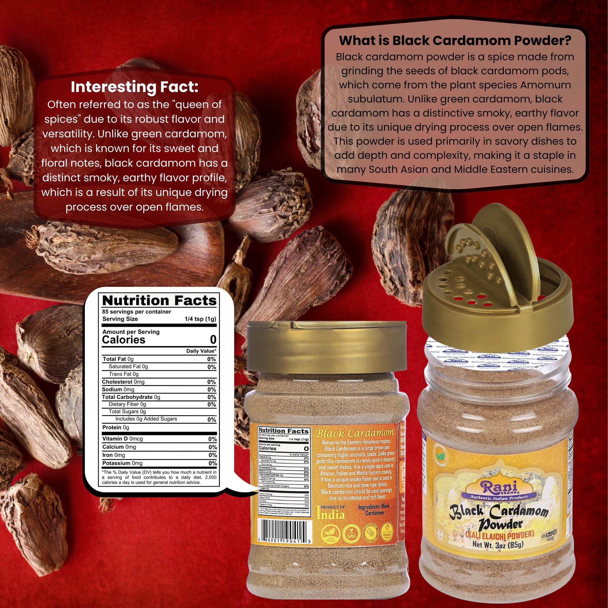 - Q: What is the net weight of Rani Black Cardamom Powder? A: Rani Black Cardamom Powder is available in a net weight of three ounces, which is approximately eighty-five grams.
