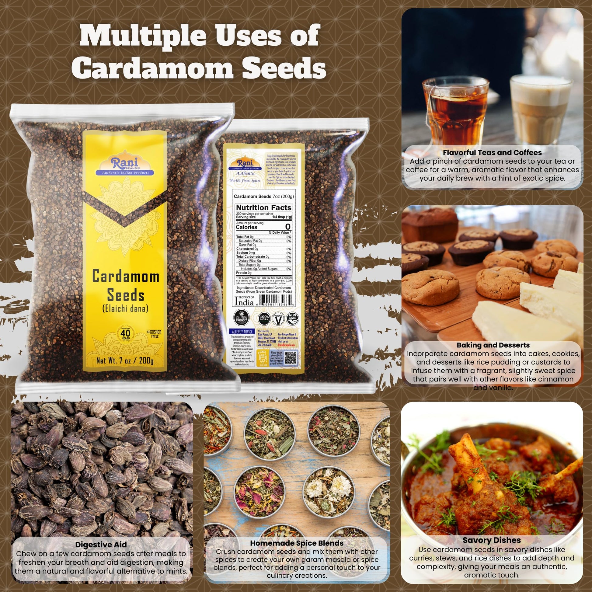 Q: Where is Rani Cardamom sourced from?A: Rani Cardamom seeds are sourced directly from India, ensuring an authentic flavor that sets them apart from many other brands that may source from Guatemala.