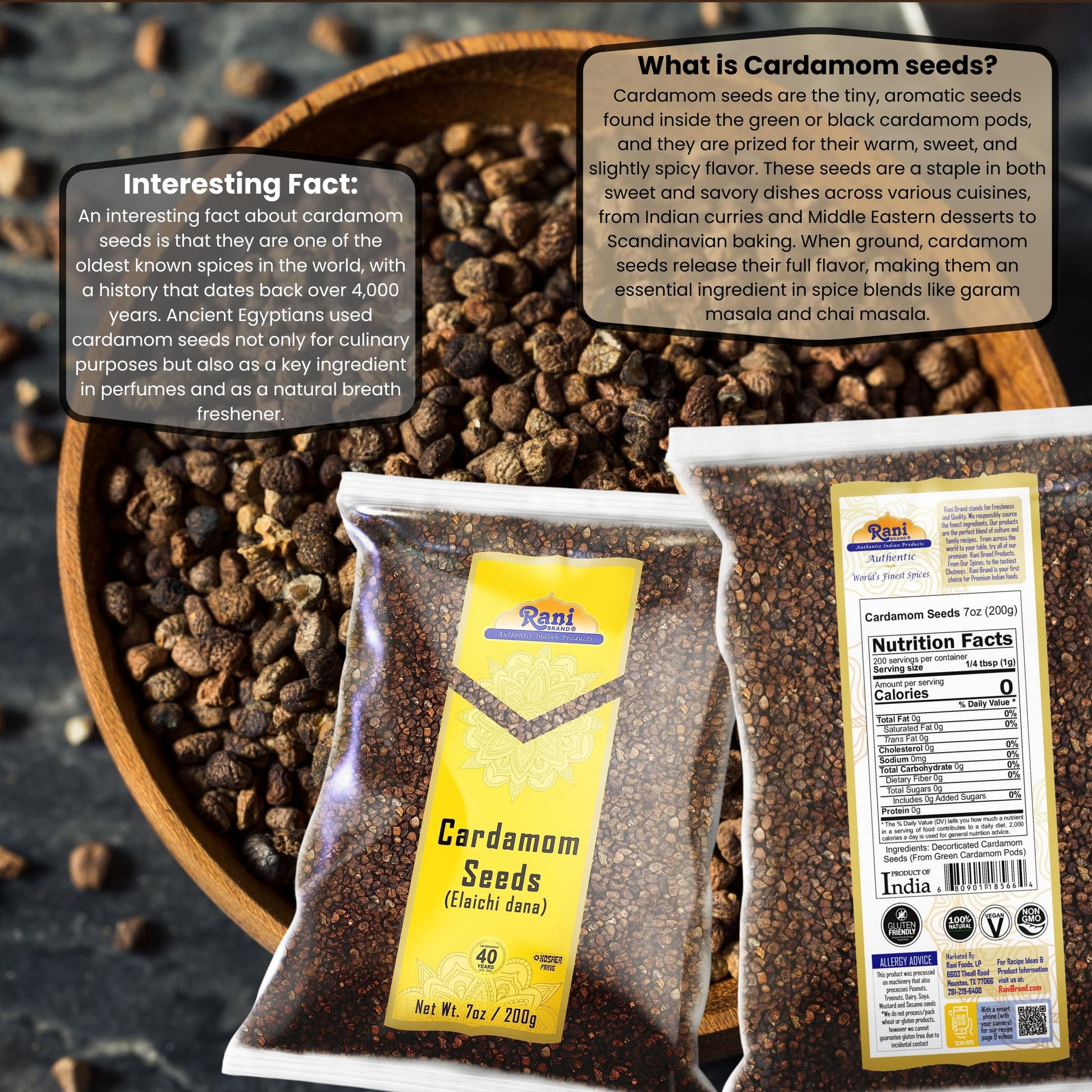 Q: Is Rani Cardamom suitable for vegan and gluten-free diets?A: Yes, Rani Cardamom seeds are 100% natural, non-GMO, vegan, and gluten-friendly, making them a perfect spice for those following special dietary restrictions.