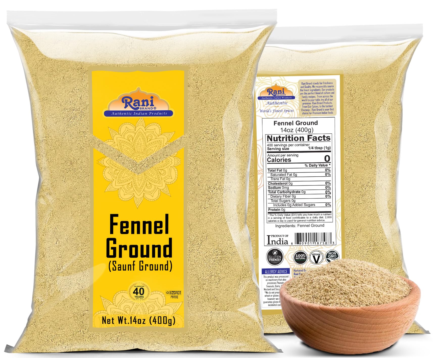 - Q: Is Rani Fennel Ground Powder suitable for people with dietary restrictions? A: Yes, Rani Fennel Ground Powder is gluten-friendly, non-GMO, kosher, and vegan, making it suitable for individuals with various dietary restrictions. Always check packaging for any specific allergens.