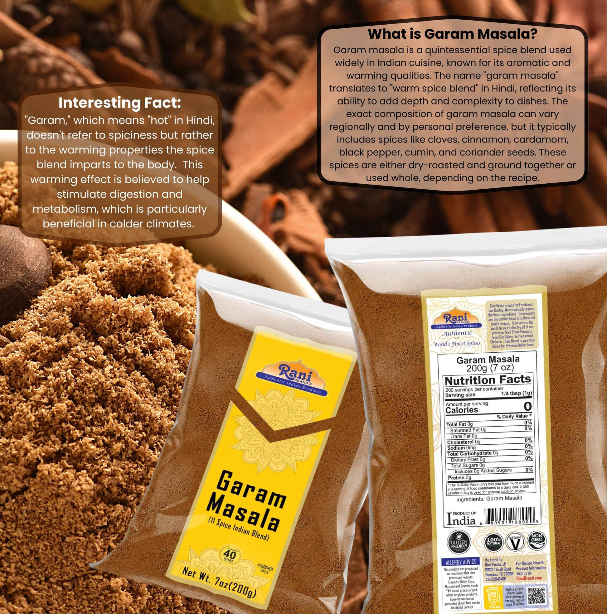 - Q: What are the main ingredients in Rani Garam Masala? A: Rani Garam Masala contains an authentic blend of eleven spices, including warming ingredients like cinnamon, mace, and ginger, which contribute to its rich flavor and aroma.
