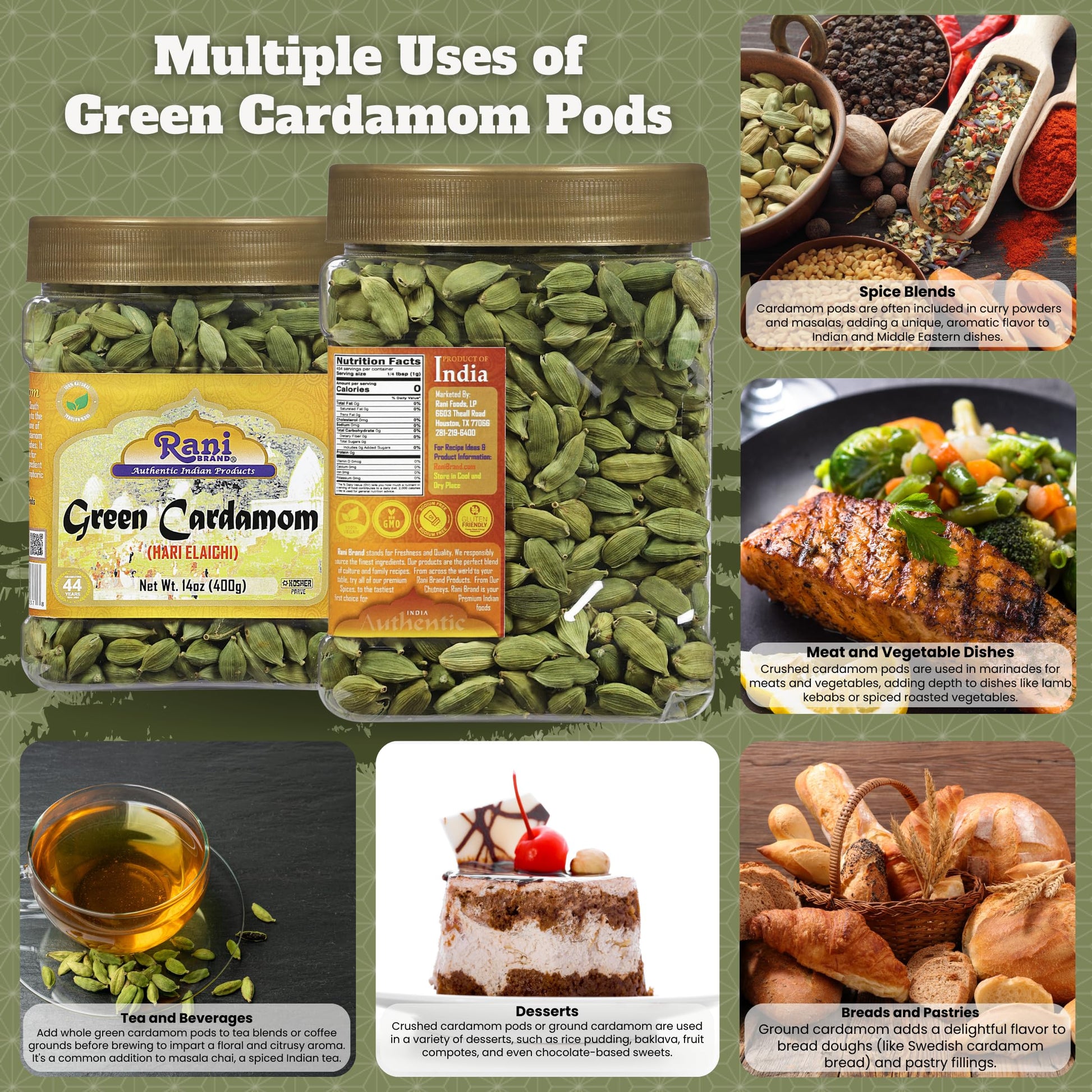 - Q: What are some recipes that include Rani Green Cardamom Pods? A: Rani Green Cardamom Pods can be used in a variety of recipes, including savory rice pudding, Indian masalas, and baked goods. A popular recipe is Savory Rice Pudding, which incorporates cardamom pods for a fragrant touch.