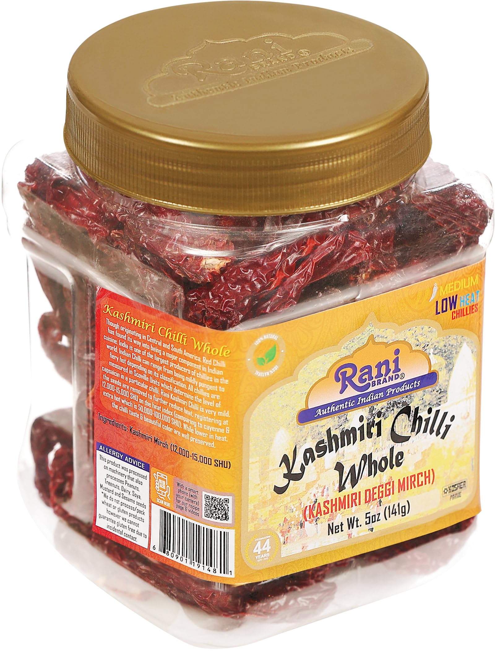 Rani Kashmiri Chilli Whole Stemless (Deggi Mirch, Low Heat) 5Oz (141G) Pet Jar ~ Natural | Salt-Free | Vegan | No Colors | Gluten Friendly | Non-Gmo | Kosher | Indian Origin