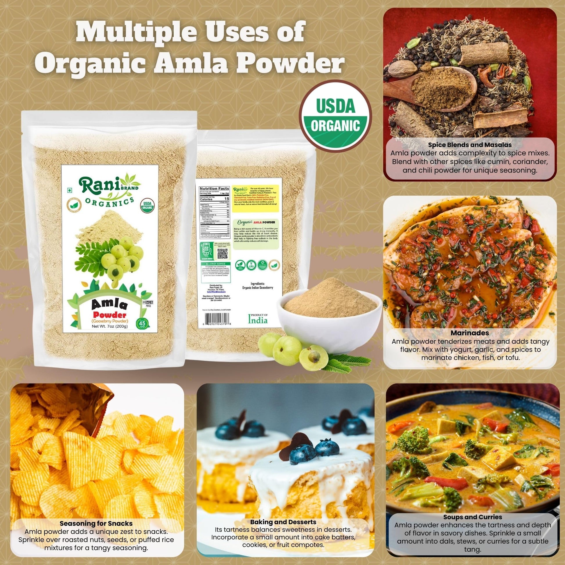 Q: What is Rani Organic Amla Powder used for?A: Rani Organic Amla Powder is primarily used in traditional Ayurvedic medicine for its numerous health benefits, including boosting immunity, promoting healthy skin and hair, and supporting digestion.