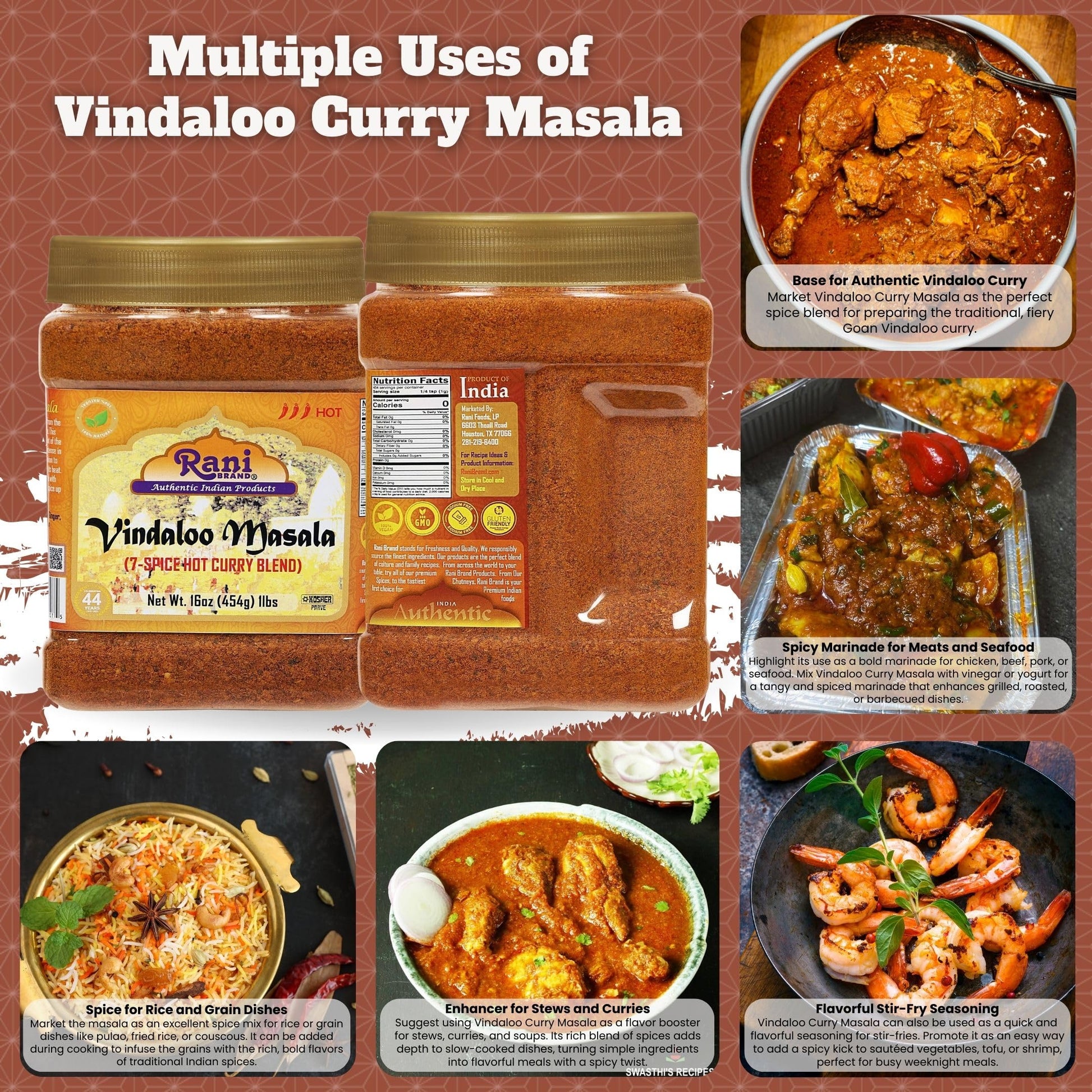 - Q: What is the net weight of Rani Vindaloo Curry Masala? A: Rani Vindaloo Curry Masala comes in a sixteen-ounce (one pound) jar, which is approximately four hundred fifty-four grams.