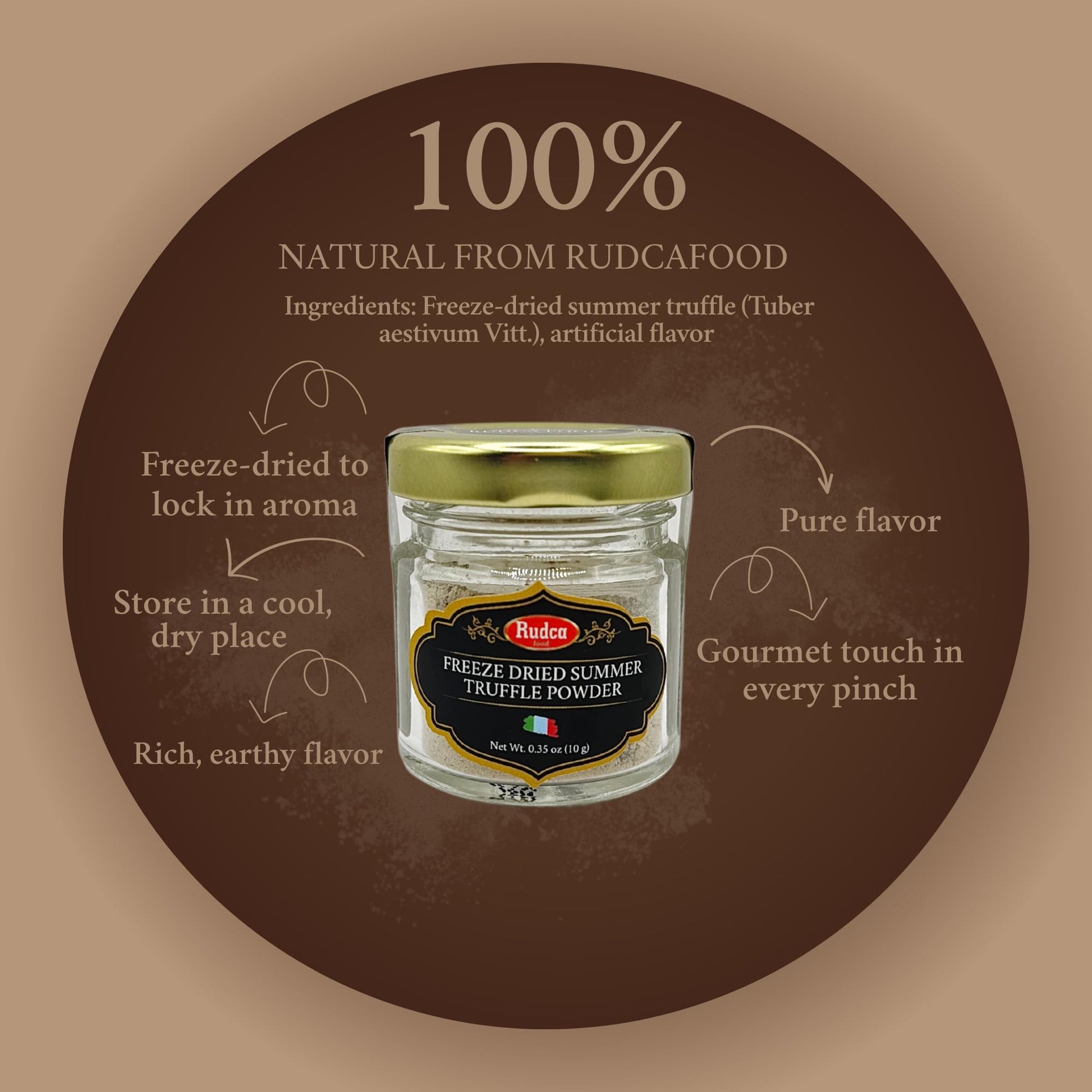 - Q: What is Rudca Food Freeze-Dried Summer Truffle Powder made from? A: Rudca Food Freeze-Dried Summer Truffle Powder is made from 100% natural freeze-dried summer truffles, specifically Tuber aestivum Vitt., with a touch of flavor added to preserve its aroma.