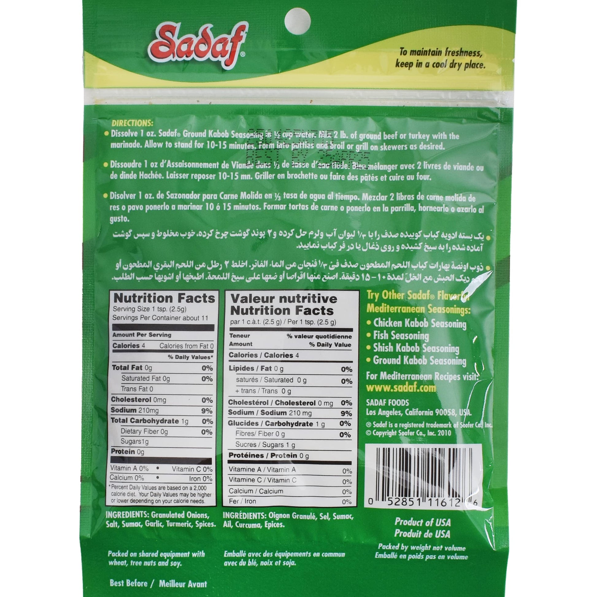 Q: What are the main ingredients in Sadaf Meat Kabob Seasoning?A: The main ingredients in Sadaf Meat Kabob Seasoning include onions, garlic, sumac, parsley, salt, pepper, turmeric, and other spices, which together create a flavorful blend for your meats.
