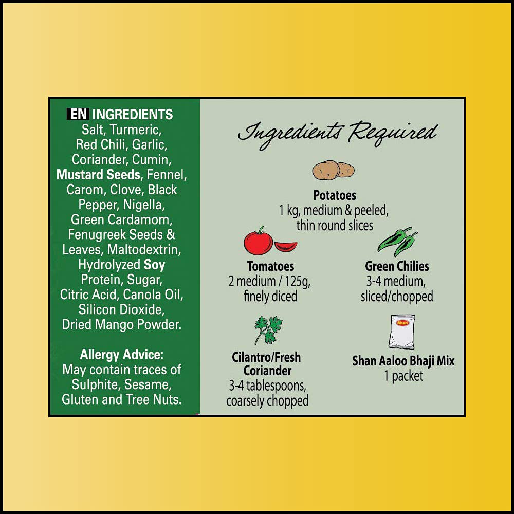 - Q: What are the key ingredients in Shan Aloo Bhaji Masala? A: Shan Aloo Bhaji Masala includes a blend of traditional Indian spices such as cumin, mustard seeds, fennel, and black pepper. These ingredients are selected to provide a rich and aromatic flavor profile for your potato dishes.
