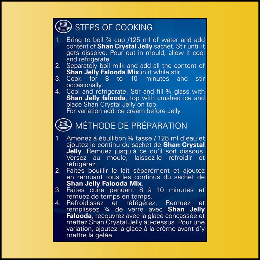 - Q: What is Shan Jelly Falooda Dessert Mix and how do I use it? A: Shan Jelly Falooda Dessert Mix is a convenient powder mix that allows you to prepare a delicious traditional dessert at home. To use it, simply follow the instructions on the package to mix the powder with water or milk, add your choice of jelly, noodles, and toppings like dry fruits, and enjoy a rich and creamy treat.