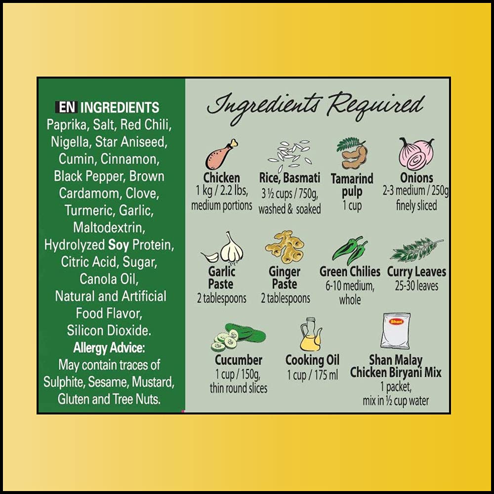 - Q: Is the Shan Malay Chicken Biryani Seasoning Mix gluten-free? A: The product does not contain gluten ingredients; however, it is advisable to check the packaging for any gluten-related information if you have specific dietary restrictions.