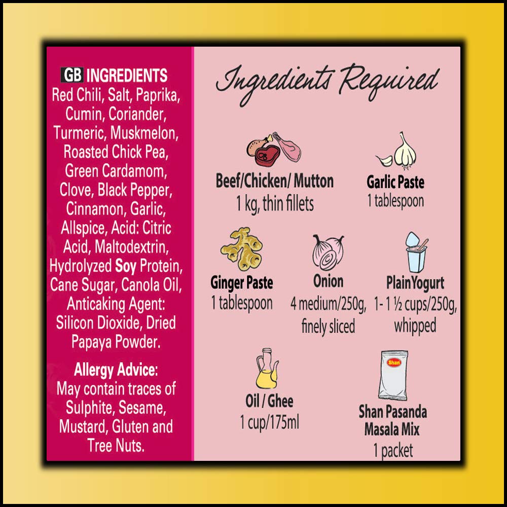 - Q: What are the key ingredients in Shan Pasanda Recipe and Seasoning Mix? A: Key ingredients in Shan Pasanda Recipe and Seasoning Mix include turmeric, garlic, and chili powder, among other spices, which contribute to its rich flavor profile.