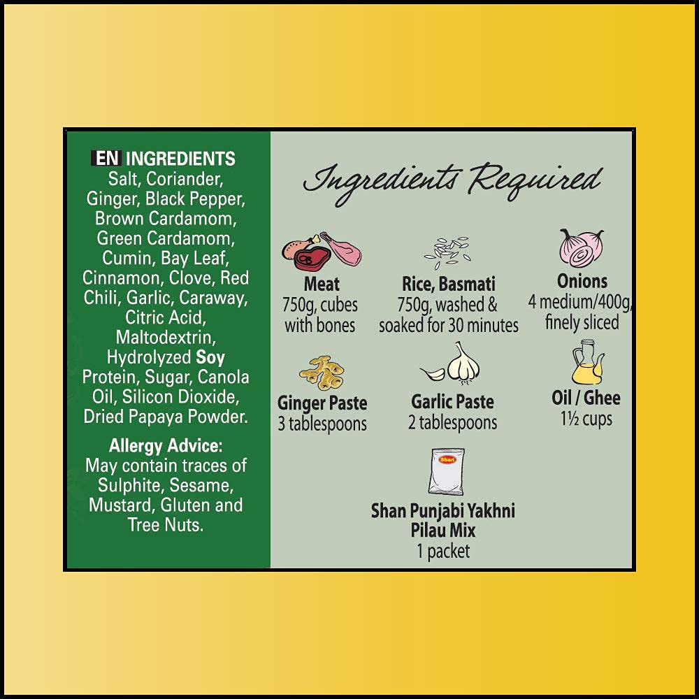 - Q: How do I use Shan Punjabi Yakhni Pilau Masala in my cooking? A: To use Shan Punjabi Yakhni Pilau Masala, simply follow the recipe instructions on the packaging. Typically, add the spice mix to your meat or vegetable preparations along with rice, and cook according to your desired recipe for a flavorful dish.