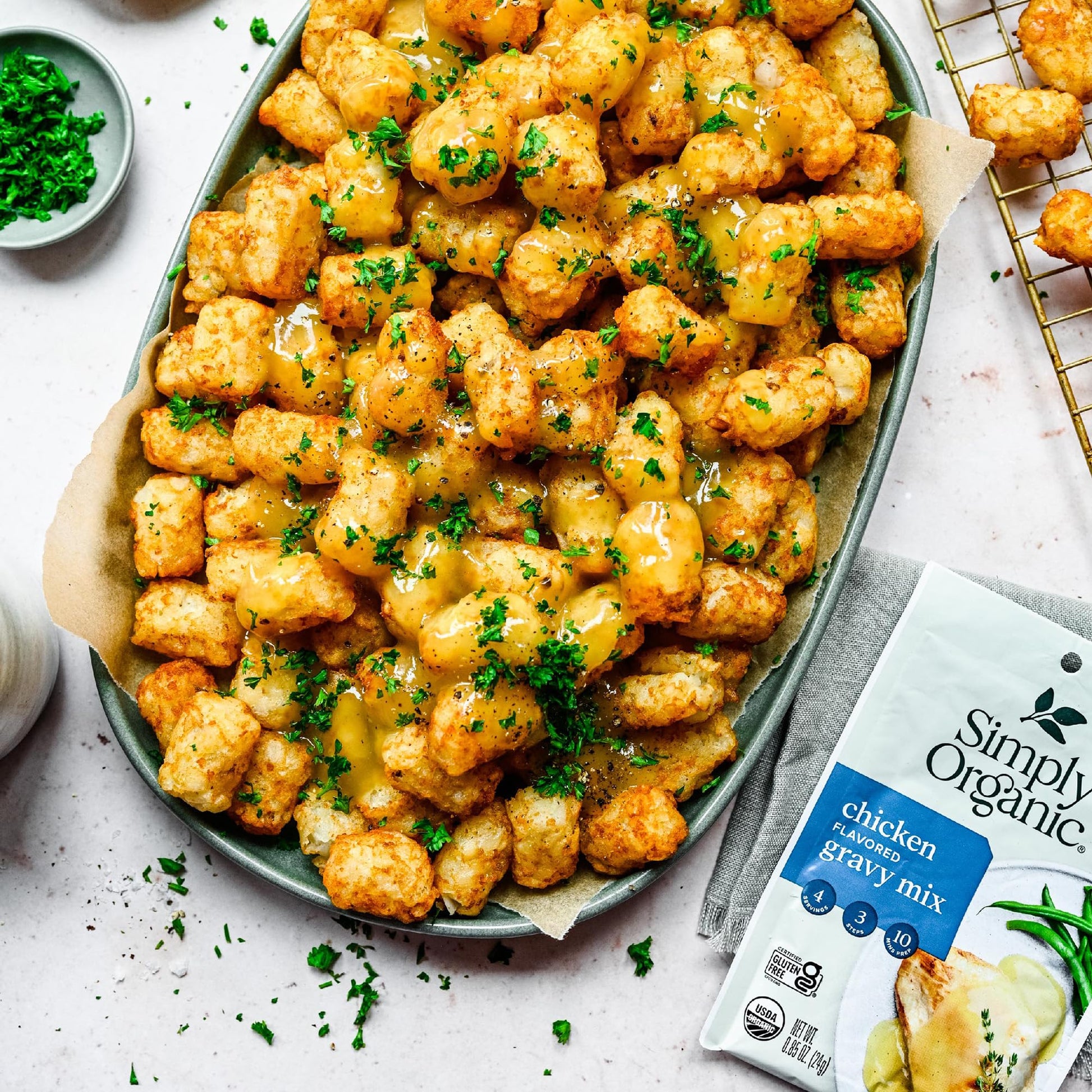 Q: What is Simply Organic Chicken Flavored Gravy Mix made of?A: Simply Organic Chicken Flavored Gravy Mix is made from a blend of organic ingredients, including onion, garlic, black pepper, celery seed, turmeric, and organic chicken flavor. It is 100% certified organic and kosher.