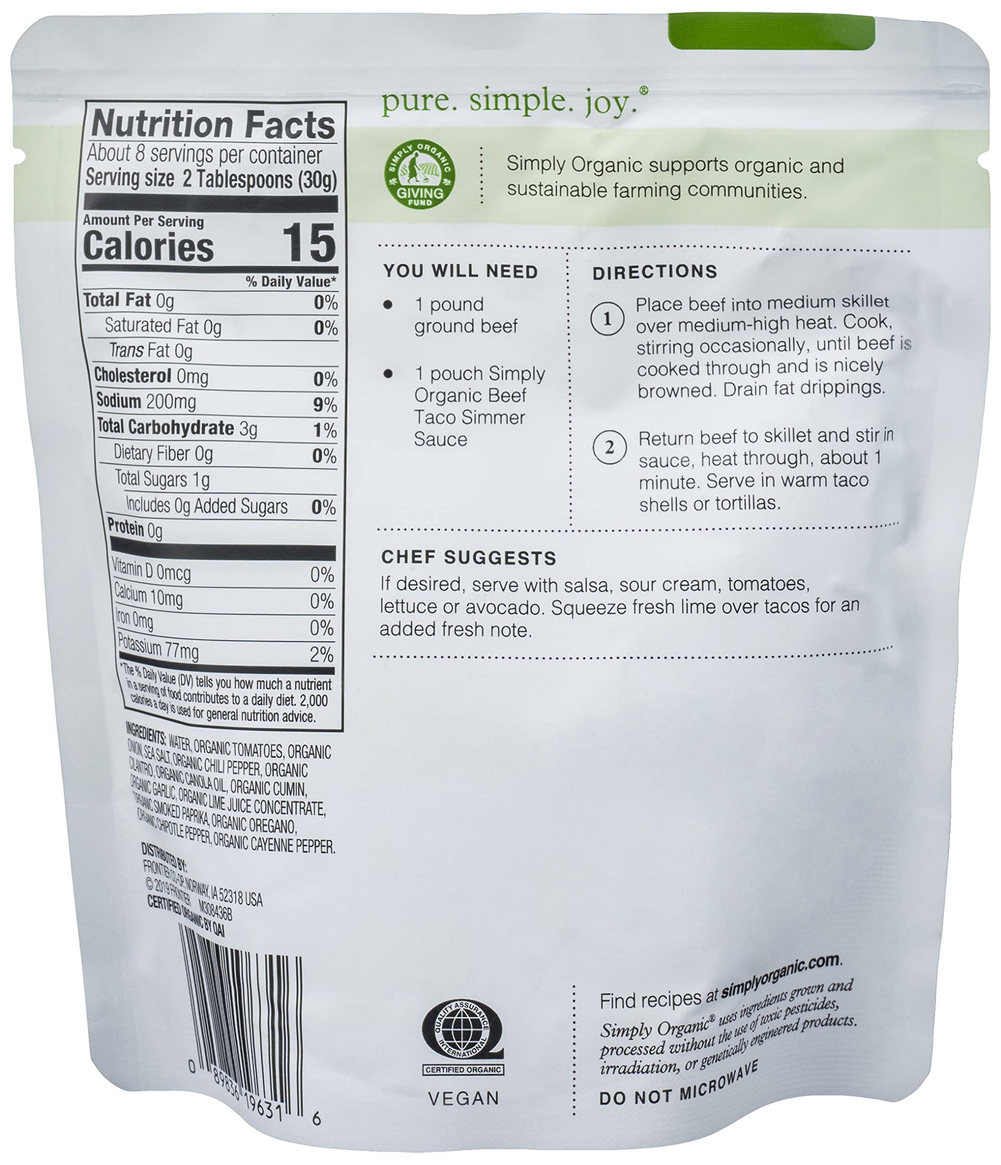 Q: Where is Simply Organic Southwest Taco Simmer Sauce sourced from?A: Simply Organic is committed to supporting organic and sustainable farming communities, sourcing its ingredients responsibly to ensure quality and environmental sustainability.
