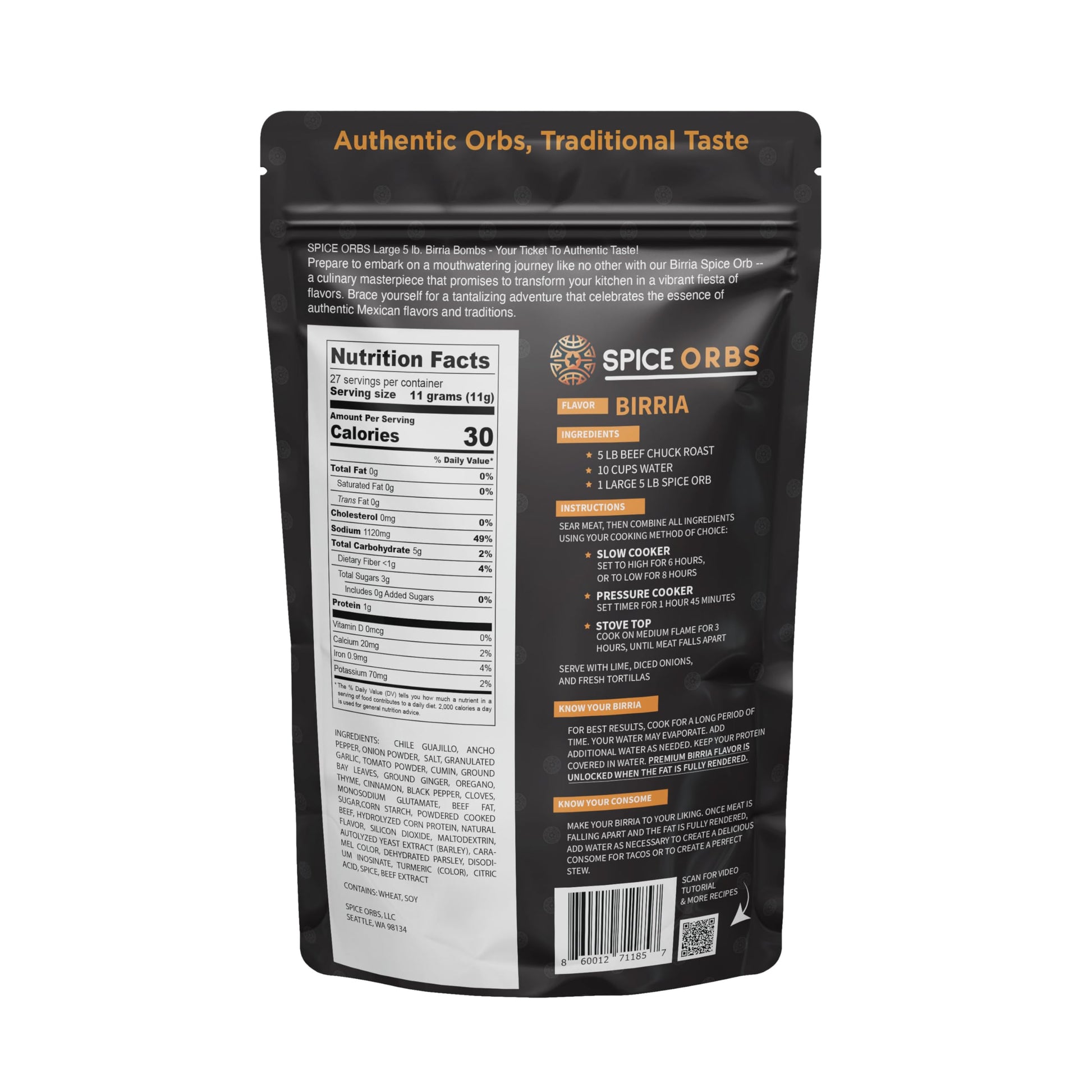 - Q: What is the size of each SPICY Birria Spice Orb pack? A: Each pack of SPICY Birria Spice Orbs weighs three point eight five ounces and contains two spice orbs, which are sufficient for multiple servings of Birria.