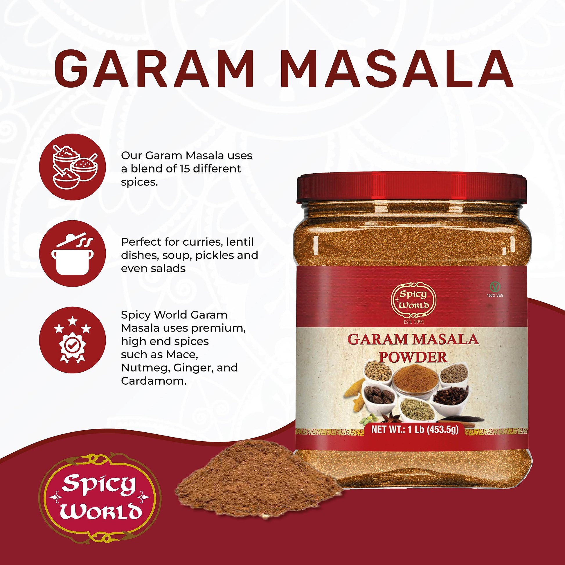 Q: What are the main ingredients in Spicy World Garam Masala Powder?A: Spicy World Garam Masala Powder is made from a premium blend of 15 spices, including Mace, Nutmeg, Ginger, and Cardamom, ensuring a rich and authentic flavor for your dishes.