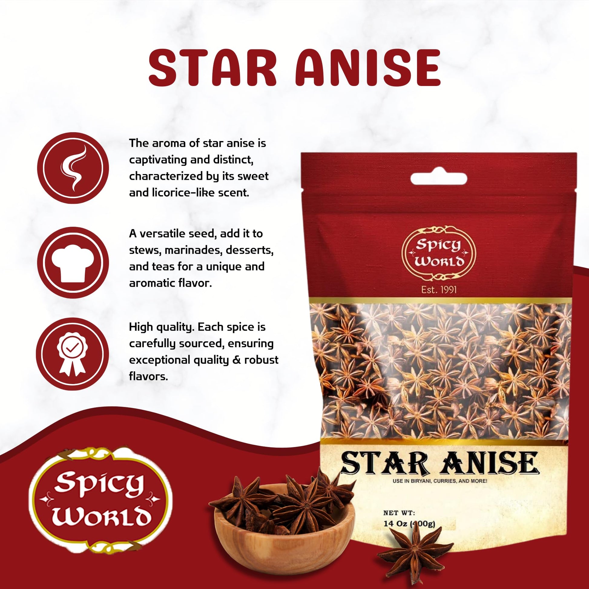- Q: How should I store my Spicy World Star Anise pods for optimal freshness? A: To maintain freshness, store your Spicy World Star Anise pods in a cool, dry place in their resealable bag. Keeping them away from direct sunlight and moisture will help preserve their flavor and aroma for an extended period.