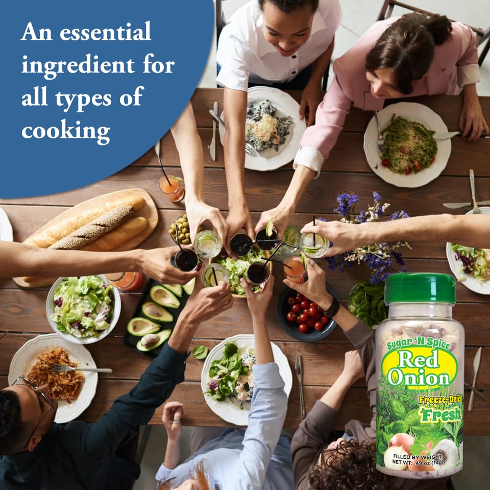 Q: How can I use Sugar 'N Spice freeze-dried red onion in my cooking?A: You can easily incorporate freeze-dried red onion in various dishes such as soups, stews, salads, tacos, and sandwiches. Simply rehydrate with water or sprinkle it directly into your recipes for an enhanced taste.