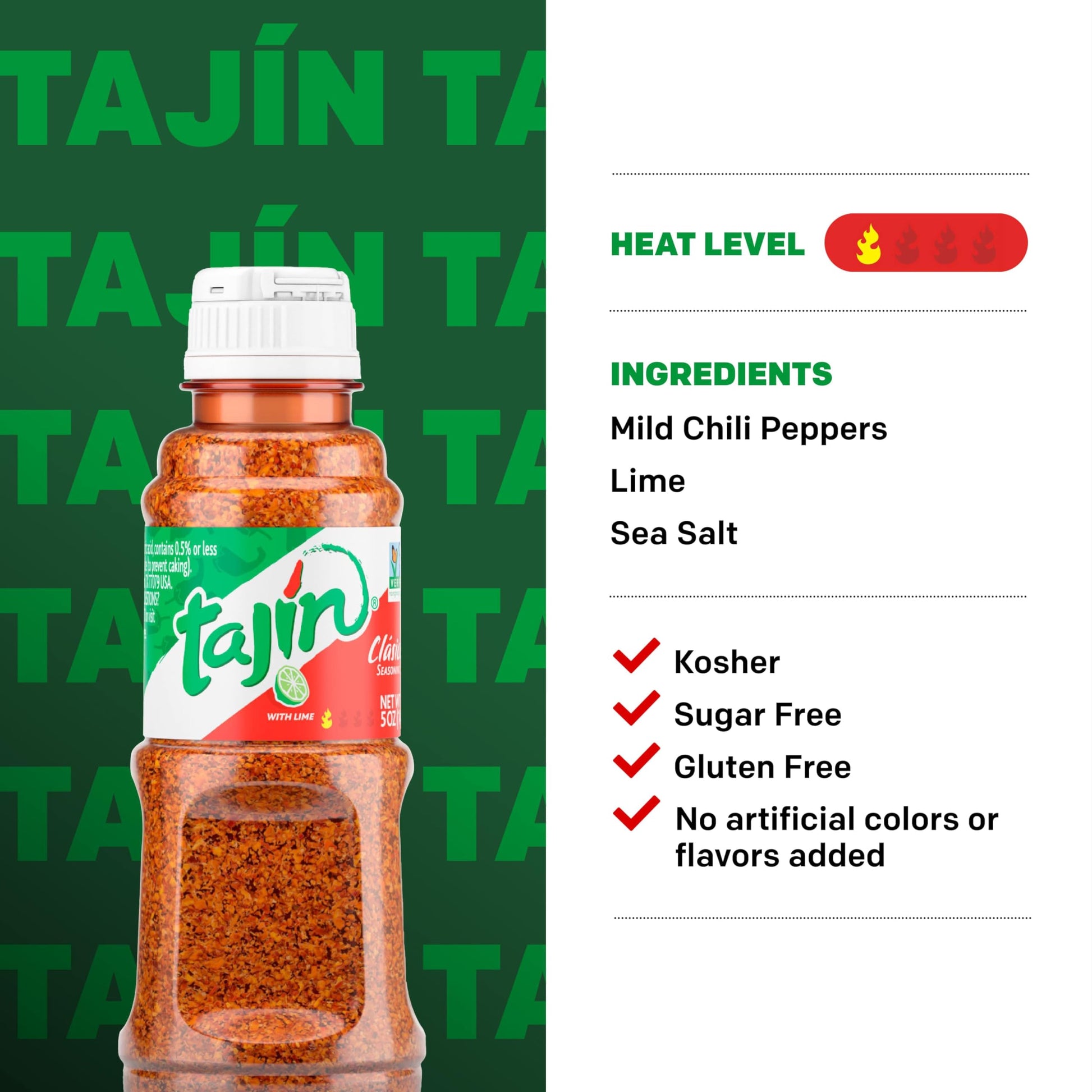 Tajin Clasico Seasoning with Lime, 5 Ounces Tajin seasoning made with a unique blend of 100% natural chili peppers, lime, and sea salt Adds another layer of flavor with just the right amount of heat Comes in a convenient bottle with a flip-top opening 5-ounce shaker is the ideal choice to share tasty and fun moments with your family Add to meat, poultry, and seafood for more flavor Sprinkle Tajin on fruit, veggies, salads, and even your favorite drinks Non-GMO, Kosher, and contains no artificial colors or flavors Does not contain allergens such as milk, seafood, soy, wheat, egg, or nuts