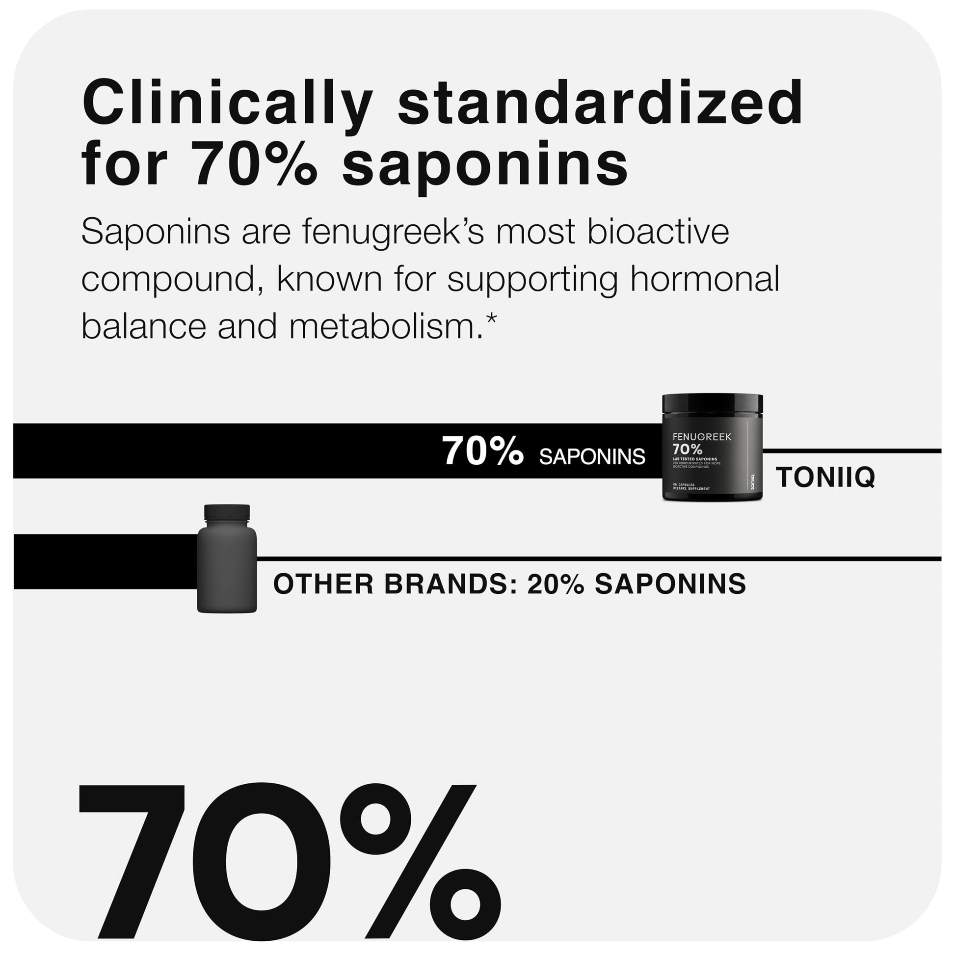 - Q: What are the main ingredients in Fenugreek Capsules? A: The main ingredient in Fenugreek Capsules is fenugreek extract, which is standardized to contain seventy percent saponins. Each serving delivers a concentrated dose of one thousand two hundred fifty milligrams of fenugreek extract.