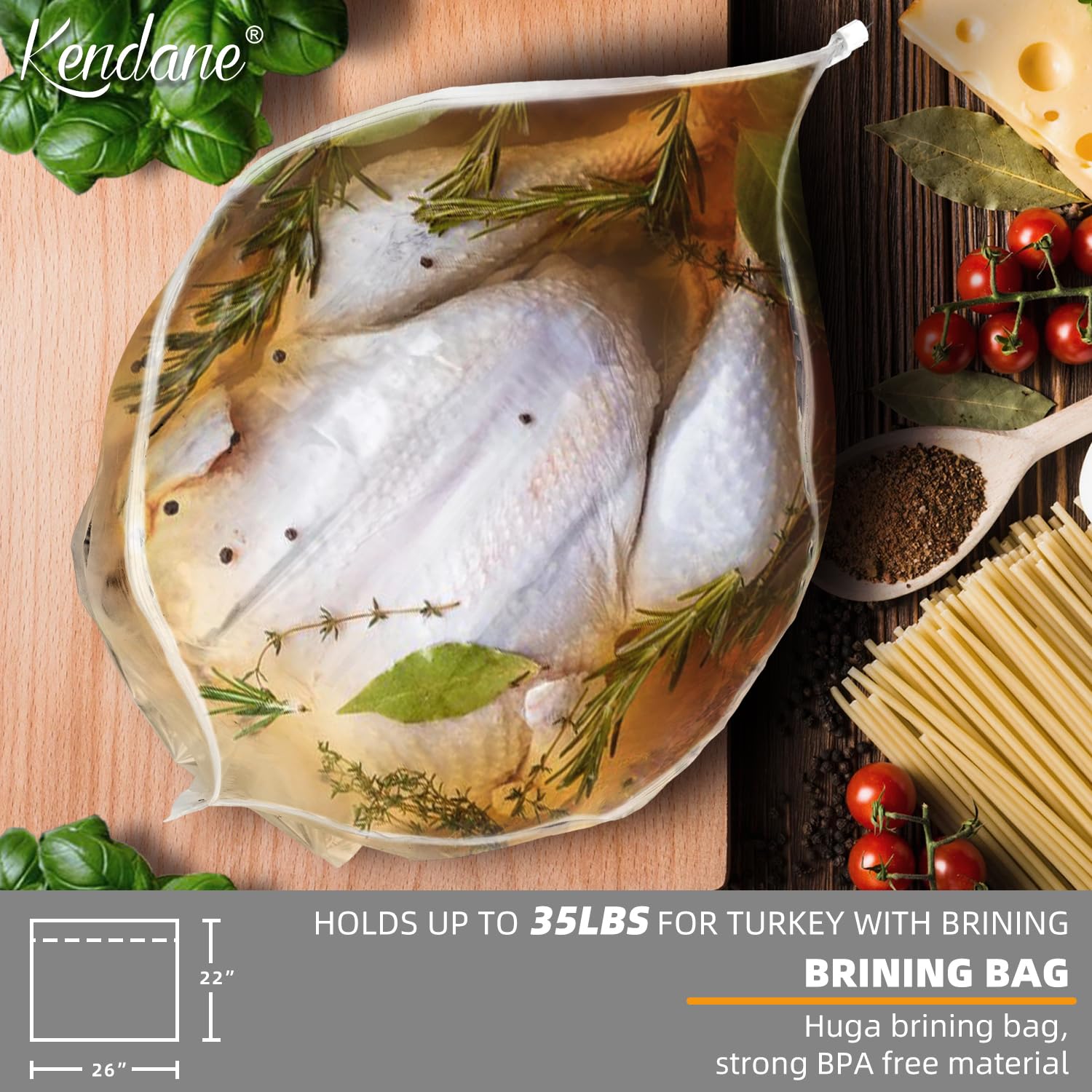 Q: What size turkey can fit in the Kendane brining bags?A: The Kendane brining bags are extra large, measuring 26"×22", and can hold up to 35 pounds of turkey, making them ideal for your Thanksgiving or holiday feasts.