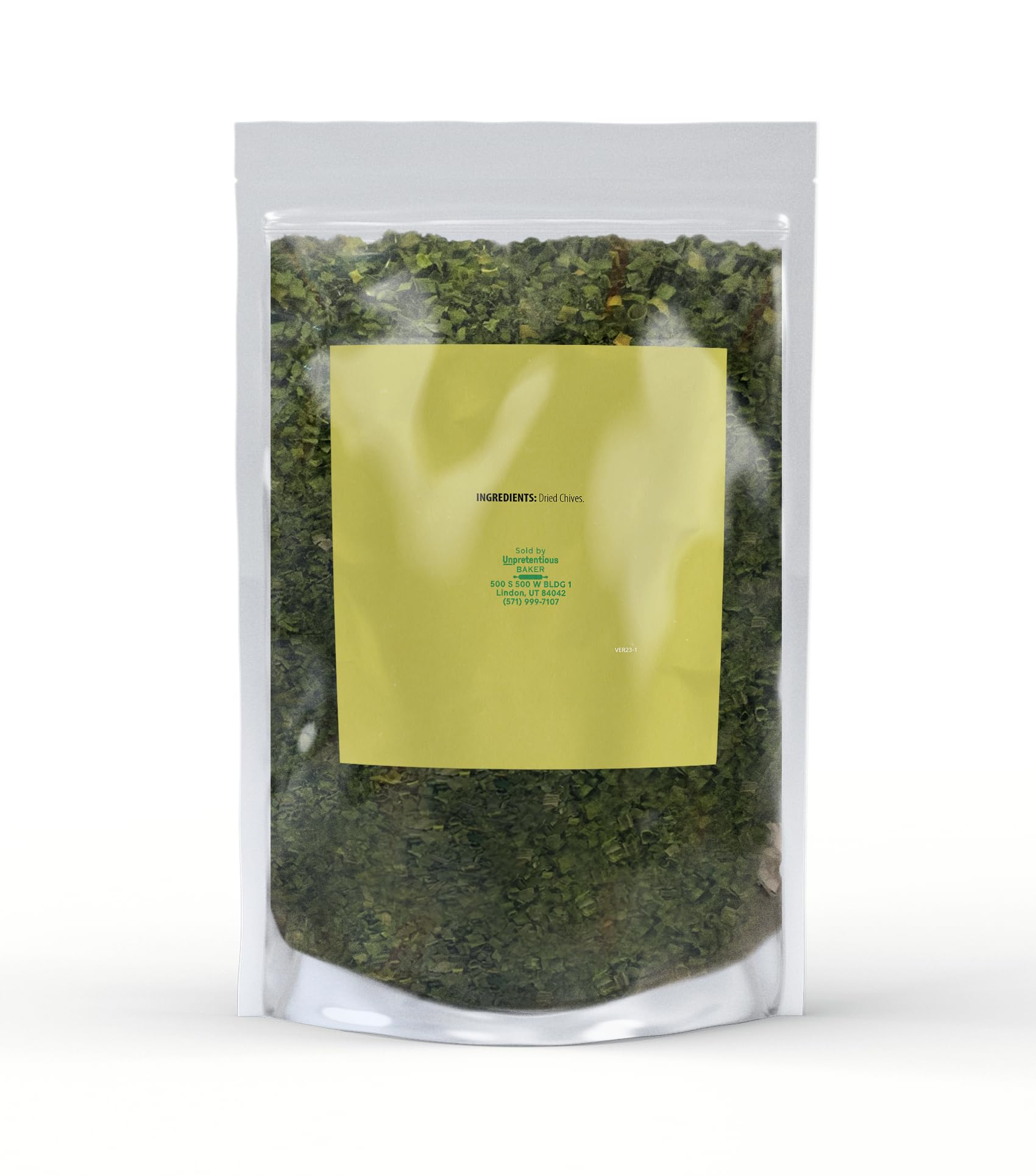 Unpretentious Baker Dried Chives in a resealable bag | Mild, light onion taste | Use as topping on baked potatoes, omelets, and more | Perfect for soups, salads, and dressings | Packaged in the USA