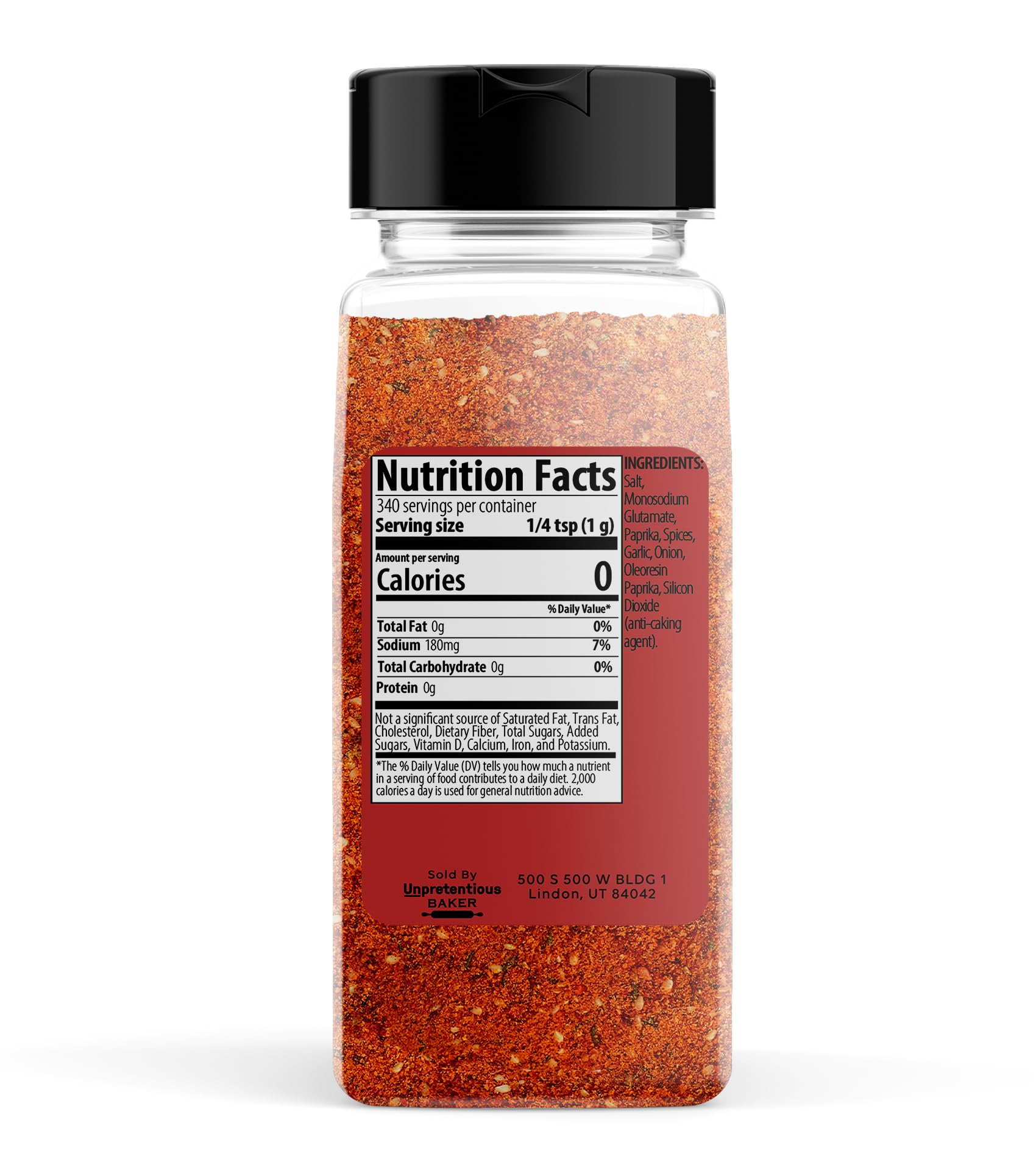 Q: What are the main ingredients in Unpretentious Red Fajita Seasoning?A: This seasoning blend includes salt, paprika, garlic, and a mix of other spices, creating a balanced flavor profile ideal for various dishes.